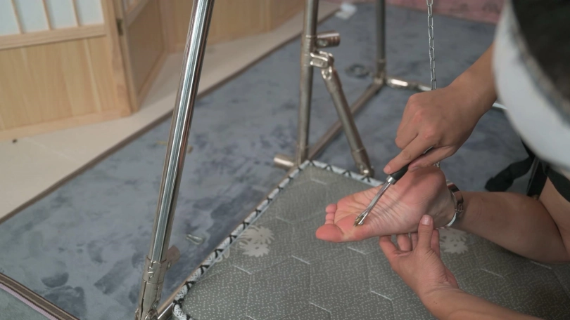 绳师这次下手挺狠,手臂反扭固定确保上半身几乎不能动,把脚腕吊起离地,她就只能小腿能动了,这次用了两种威力比较大的电击器,特别喜欢看她被电时扭动胳膊和身体的样子,而且这次持续时间也比较长,她一直挣扎,最后快精疲力尽的时候才停把遥控电击器停下来。