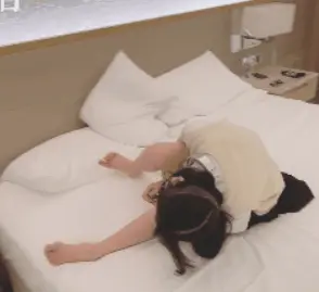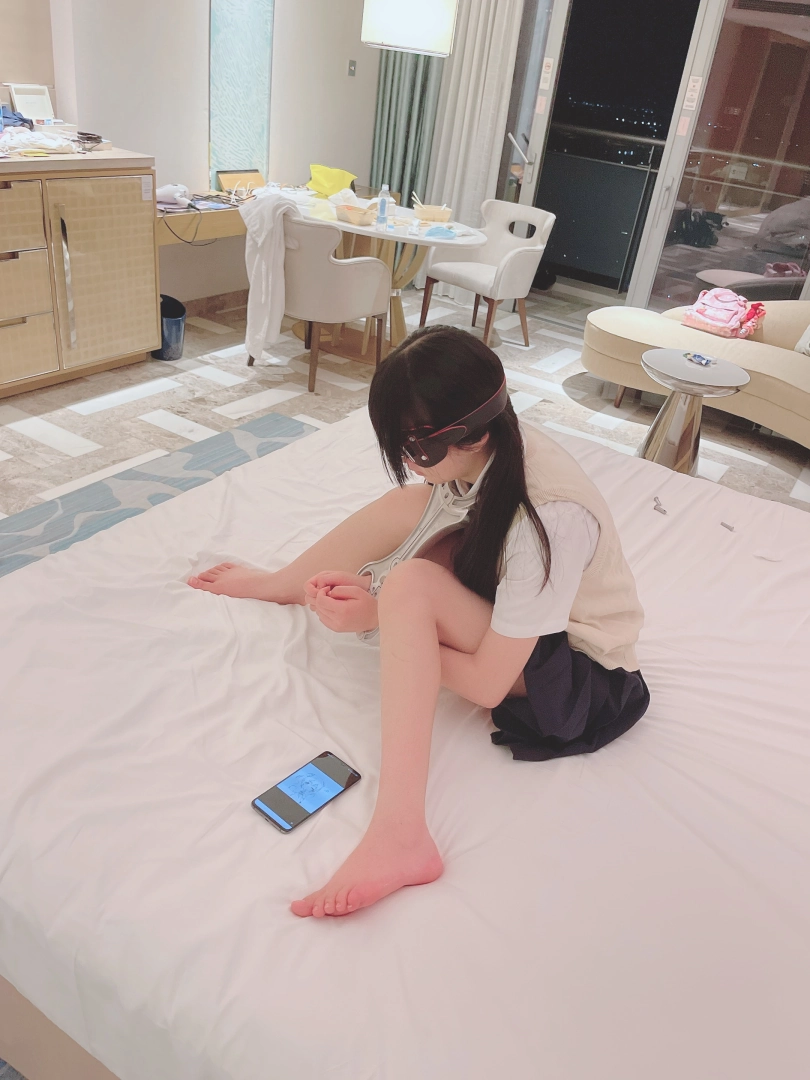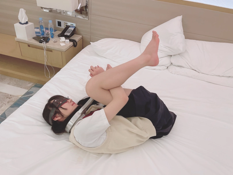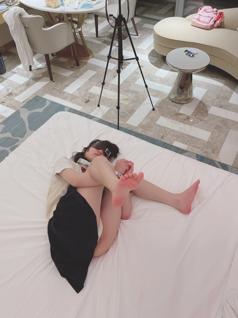 让茶茶扎起可爱的双马尾带着人字枷和脚趾铐被我牵着走路,然后把手锁在大腿下面用人字枷固定好,并命令茶茶在这个困难的姿势下艰难的移动。 可怜的茶茶只能像螃蟹一样在床上缓慢的蠕动,移动过程中一个不小心,翻过来呈四脚朝天的状态,茶茶就和小乌龟一样再也翻不回去了。好可爱好无助!我趁机玩她粉嫩的脚心。别说,茶茶的脚底和脚趾都透露着淡淡的粉红色,实在是又嫩又怕痒。