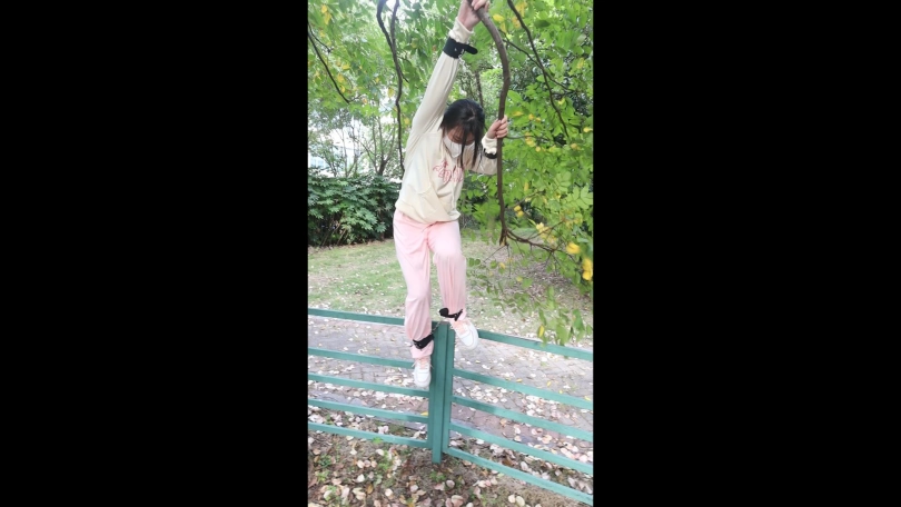 【荷约户外】十八岁的清纯运动女孩酥卡户外铐镣捆绑与 超级多的蚊子之间的战斗(自己带着铐镣高难度盼着枝头翻墙面 蹦跳 脱鞋子挣脱束缚)对话 全景实拍铐镣女孩的户外历险记