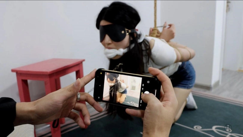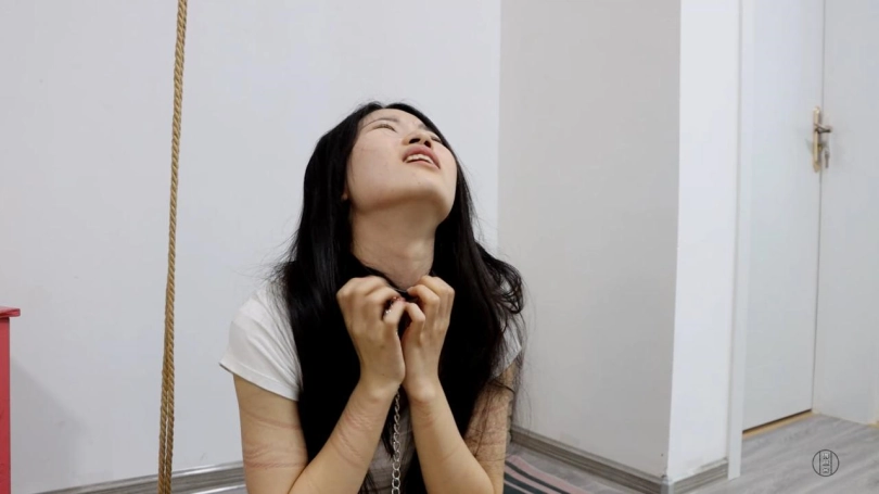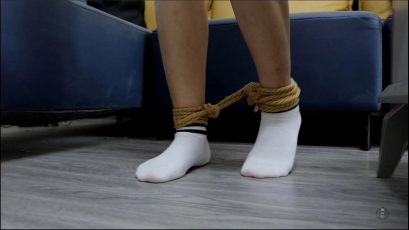 为她准备的最后一个项目,便是跪缚。将双手吊起,强制身体只能跪在那里,双腿绑好后甚至连脚趾也没放过,跪缚是最能让一个人反省的姿势(大概面具人的想法便是如此)