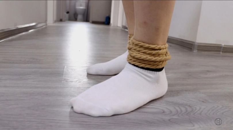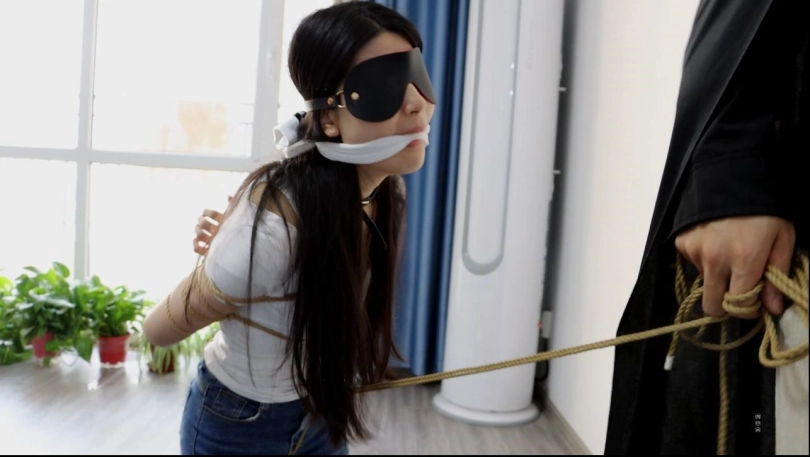 亮点:牛仔短裤,过膝白袜,四只船袜严密堵嘴,原味棉袜堵嘴,后手吊缚+拇指铐 项圈牵引,股绳牵引(跪姿爬行) 蒙眼堵嘴后跪缚+后手吊高放置