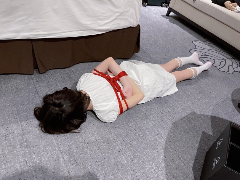 把茶茶用驷马的姿势绑住,命令茶茶趴在地上来一个折腿驷马。