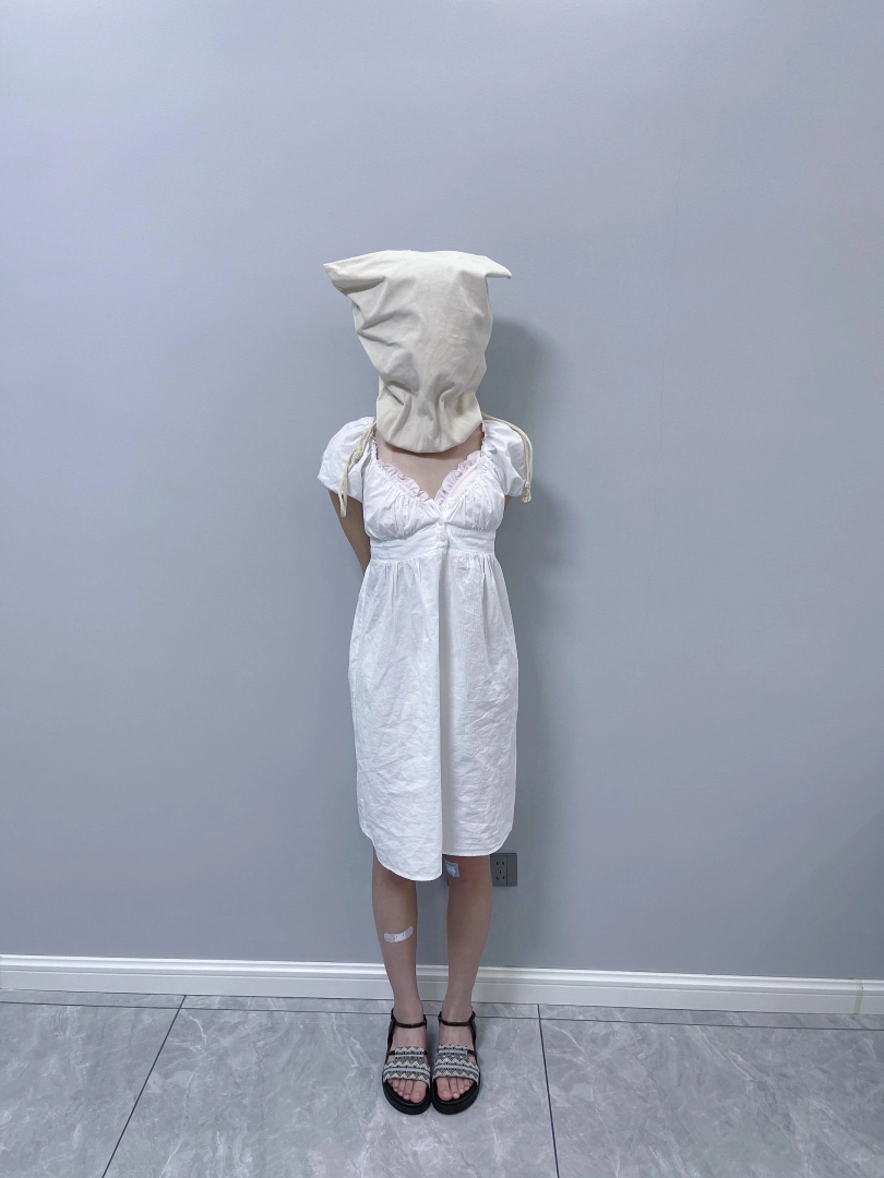 首先押送头套布袋、双手被蝴蝶铐牢牢反铐、动弹不得的小女囚茶茶登场。