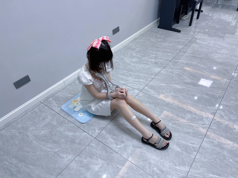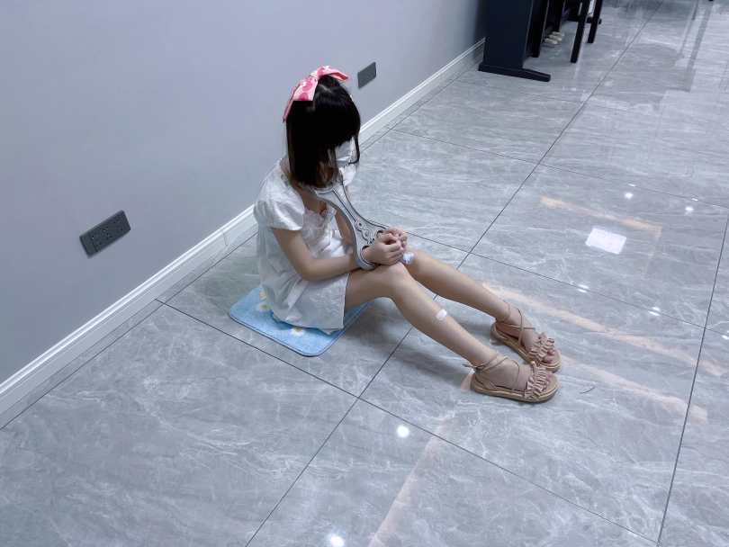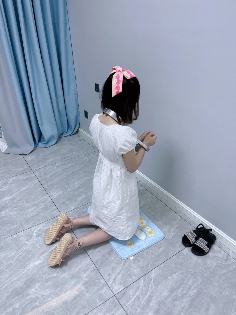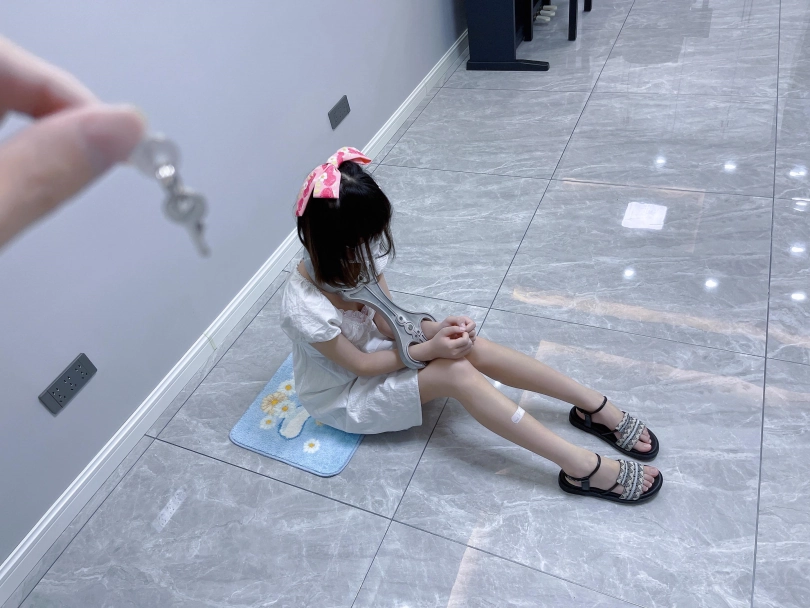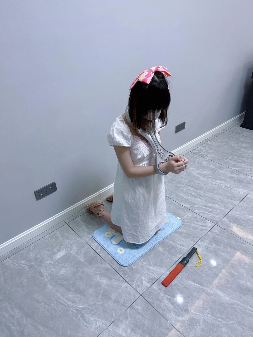 更换监狱内两种款式的凉鞋并展示。让小囚犯茶茶跪在地上,面壁思过。
