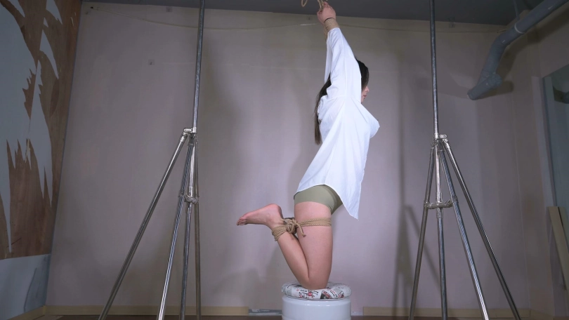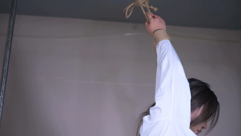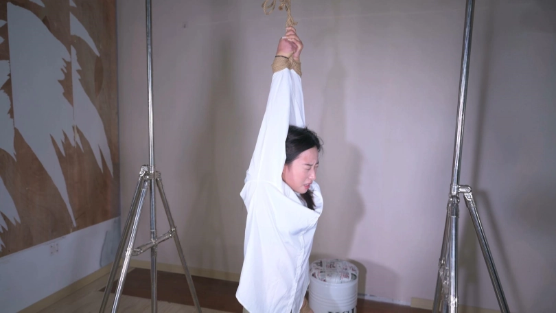 一开始给妹子商量双手悬吊,妹子担心撑不住是不同意的,就先上跪吊缚,她还给绳师提了建议增加辅助绳,那当然是不会听她的建议的,一番TK后,趁着她还悠闲自得的时候,绳师强行把支撑膝盖的铁桶撤掉,妹子直喊不行不行,但为时已晚,想象中的困难是最困难的,吊起来也就这样了。不过从妹子憋红的脸还是能看出她确实很难受也很敬业。