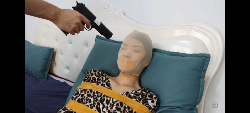 身穿豹纹连衣裙的女人在卧室休息,突然一蒙面男子持枪闯了进来并控制住了她。男子用胶带简单将她绑了起来,封住嘴巴,套上头套。然后就睡着了,女人趁男子睡着之时,偷偷溜出卧室,去客厅试图用手机求救,但是因为被套上了头套,无法面部解锁,无奈之下只好放弃。开始四处寻找能割开胶带的工具,找了好久,终于找到了一把小刀,正准备割开胶带的时候,突然一把枪就抵住了她的后脑勺。女人就这样被拖进了屋子里,男子为了防止她再逃跑,将她用胶带结结实实得绑了起来,最后,搜刮完财物的男子并没有选择放了她,而是把她放进了柜子里,关上柜门后,又将柜子的缝隙用胶带封死。伴随着女人绝望的叫声。。。。。。