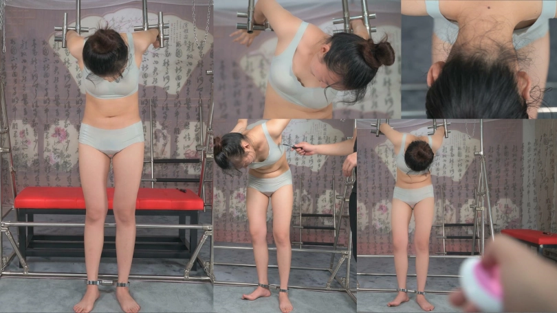 这个姿势在北方叫撅,把人的手臂反扭,手掌向上然后抬高,他就不由自主的弯腰低头。另外人的手腕其实是扁的,用钢管夹住手腕,也有了这种效果,妹子一旦被这样铐上,她是无法转回胳膊的。这次提出让妹子试一试震动,她居然问会不会疼?那么,这就好办了,“绝对不会疼,就是个按摩震动的东西”我是这样回答的,妹子在过程中说是好难受,那是肯定的,手被撅老高,是下面难受还是上面难受,其中滋味只有她自己知道吧。反正放她下来的时候,明显焉儿了。