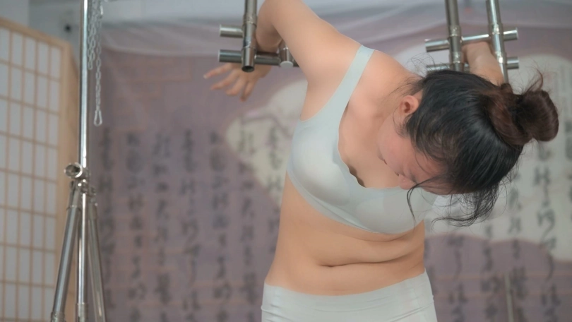 【撒琅制造】高挑美女内衣直臂反扭铁架高吊固定-初试滚刺和震动-这次整得她精疲力尽