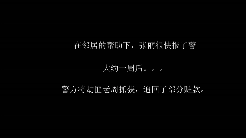 在邻居的帮助下张丽报了警,一周后警方逮捕劫匪老周,追回了部分赃款。(完)