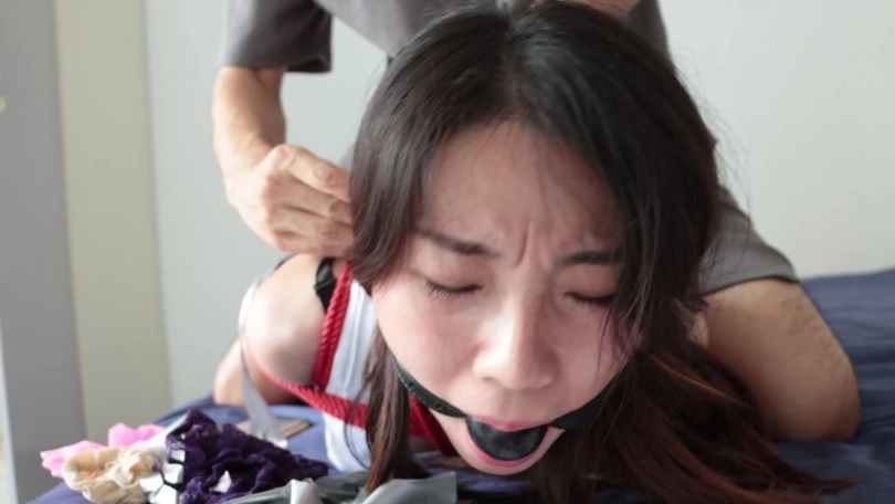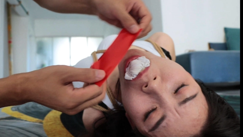 最后,男子需要休息,女子也需要,但是取下来开口器后嘴巴就是自由的吗?当然不是,棉袜堵嘴,红色布基胶带封上,也便防止女子太开心叫出来,只好堵上她的嘴巴,将美女快乐棒固定在裆部,加大功率让她一个人独乐乐!