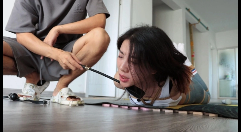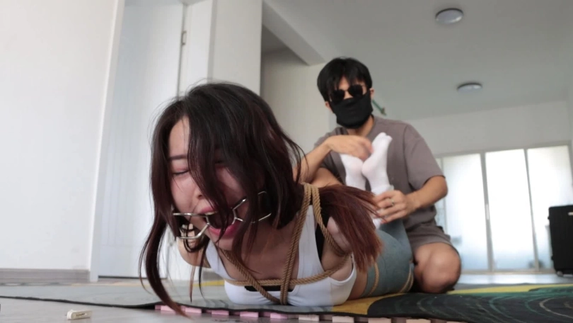 口球下场,开口器上来,夹子夹住嘴唇,,接着欧式直臂缚驷马倒攒蹄的美女趴在地上,男子脱了她的运动鞋后,压在她身上,挠她脚心,美女快乐棒怼两股中间,还不开心快乐!女子享受到呜呜并喘息