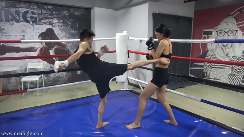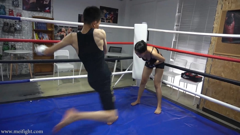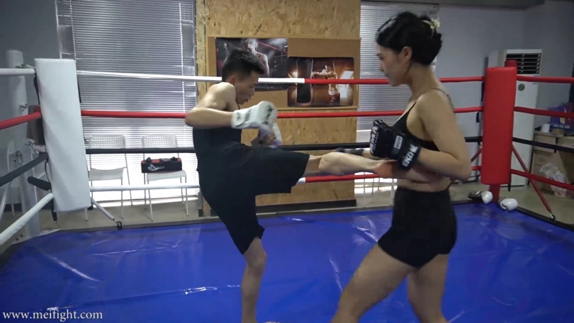 Agan was very arrogant and thought she would win this fight easily. She talked some trash to Chuan about how badly she was going to beat him, how he was no match for her. Chuan answered with some trash talk of his own, but Agan did not take him seriously. The fight started very evenly, with both Agan and Chuan hitting each other with punches and kicks.