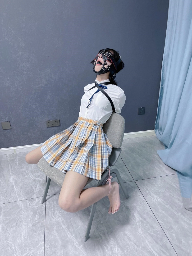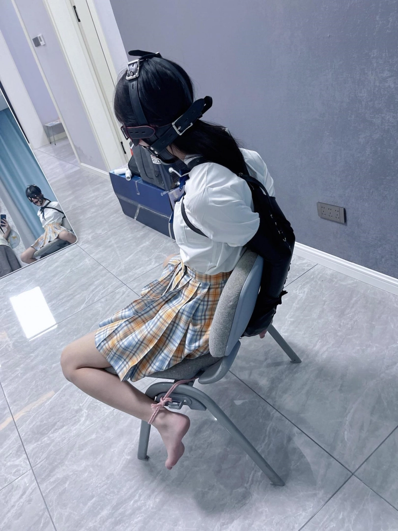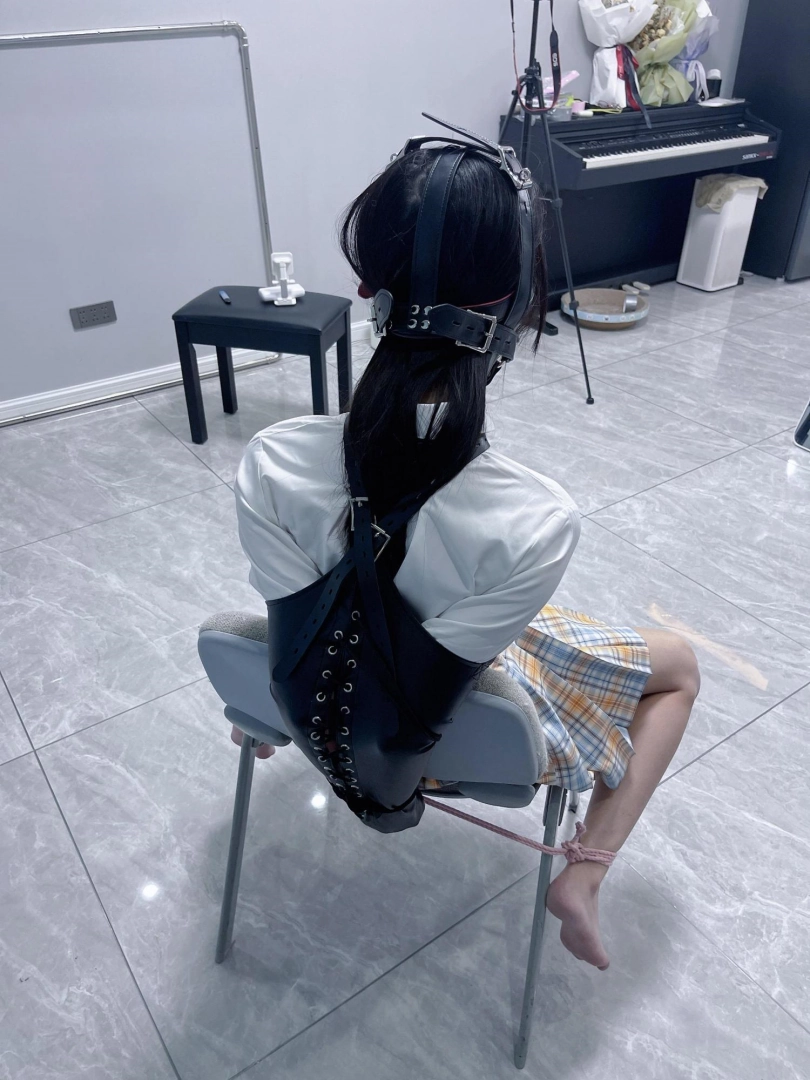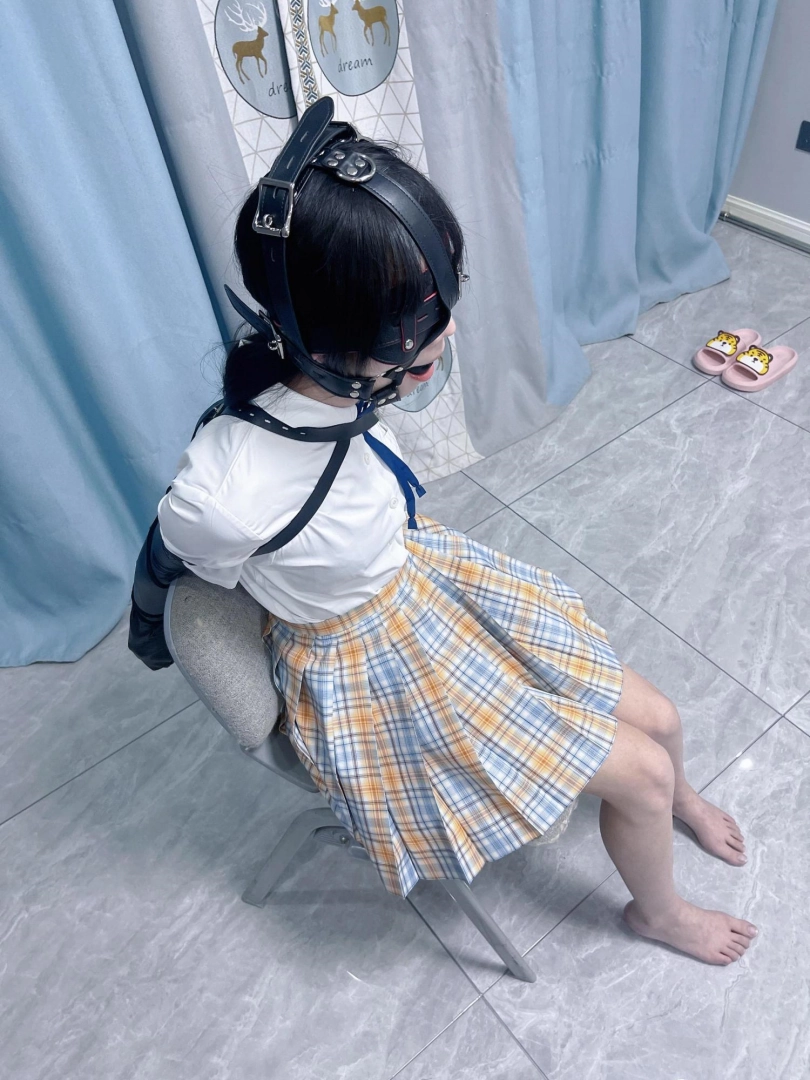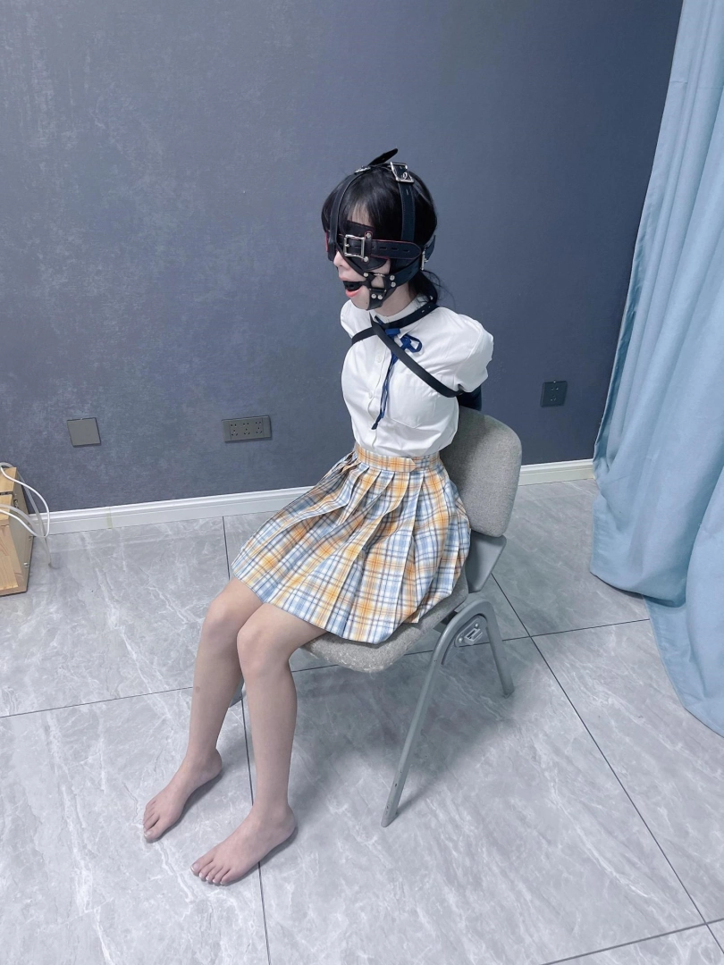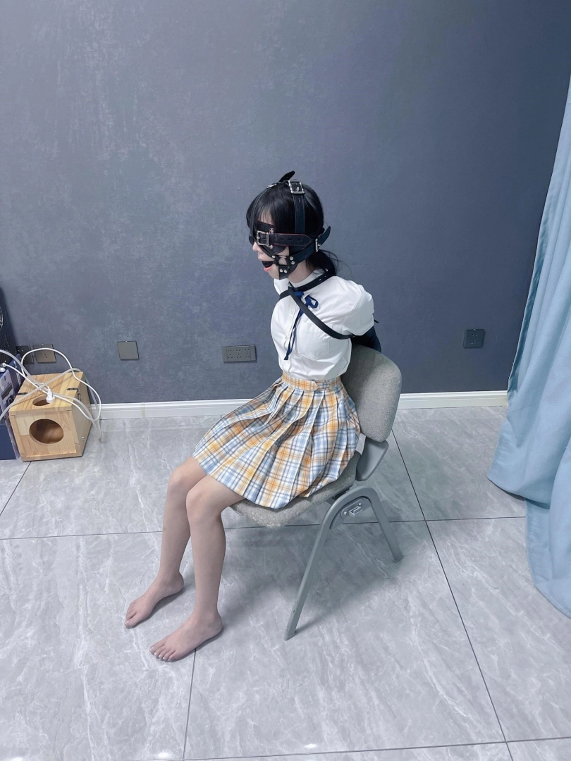所以这一部我把穿着jk光着小脚的茶茶绑在椅子上,用单手套把双臂固定在椅子背后,然后拉起茶茶的脚腕,让茶茶的脚丫翘起,这样茶茶就被死死固定在椅子上,整个身体都向观众展示,没有一丁点从椅子上挣脱的可能。