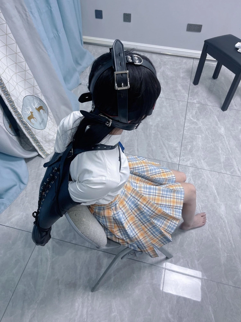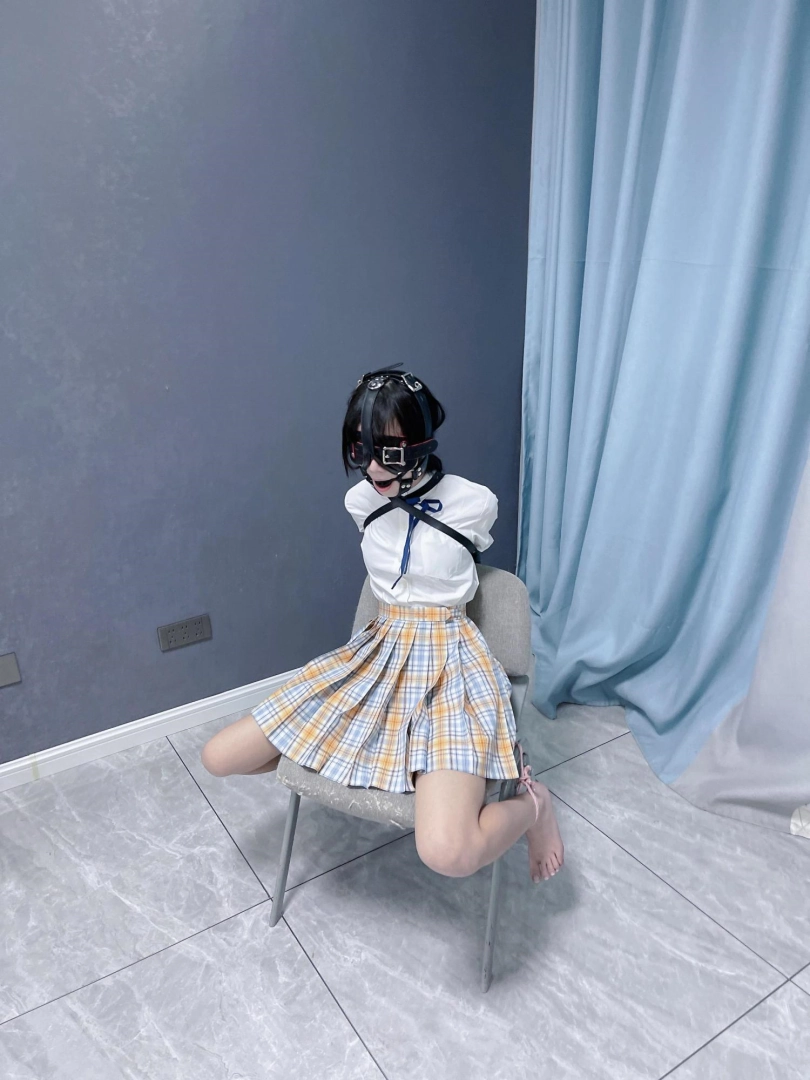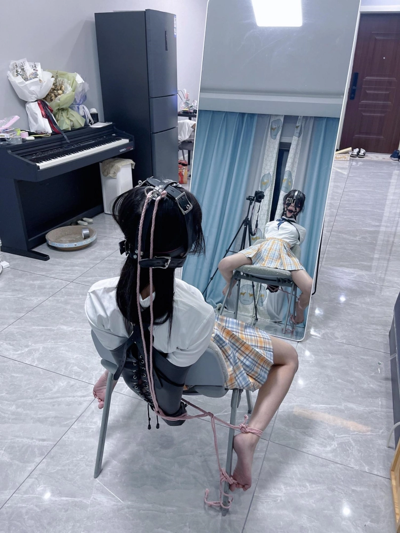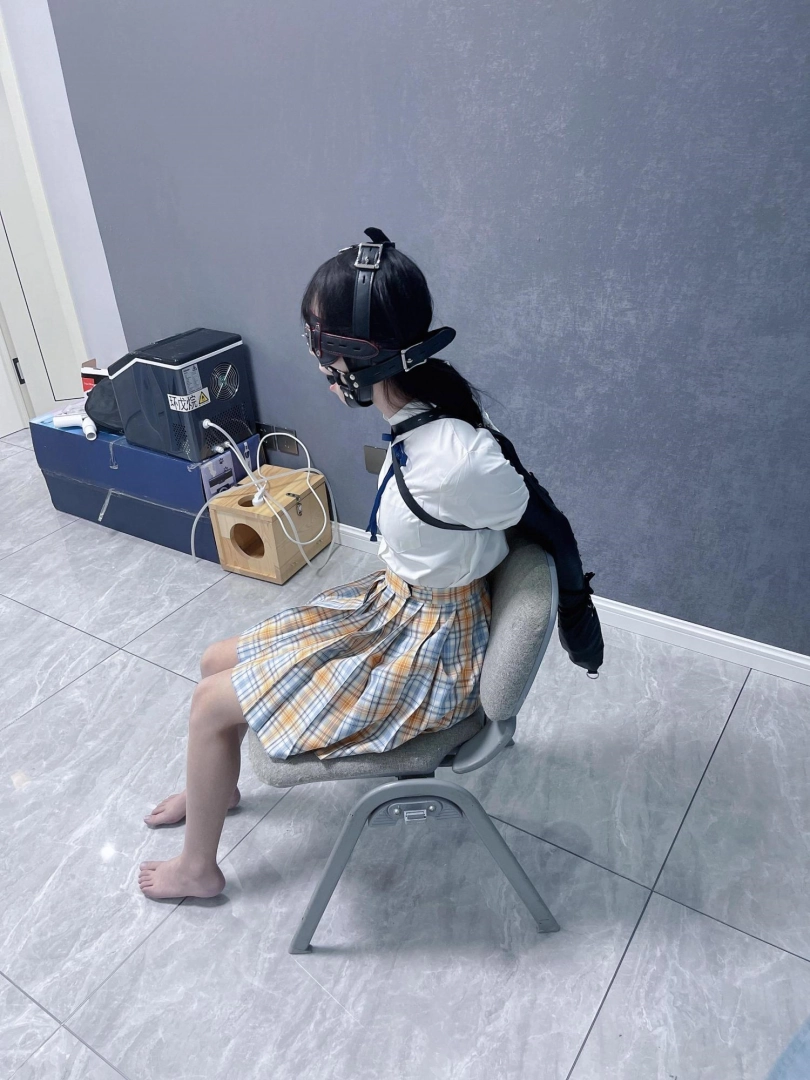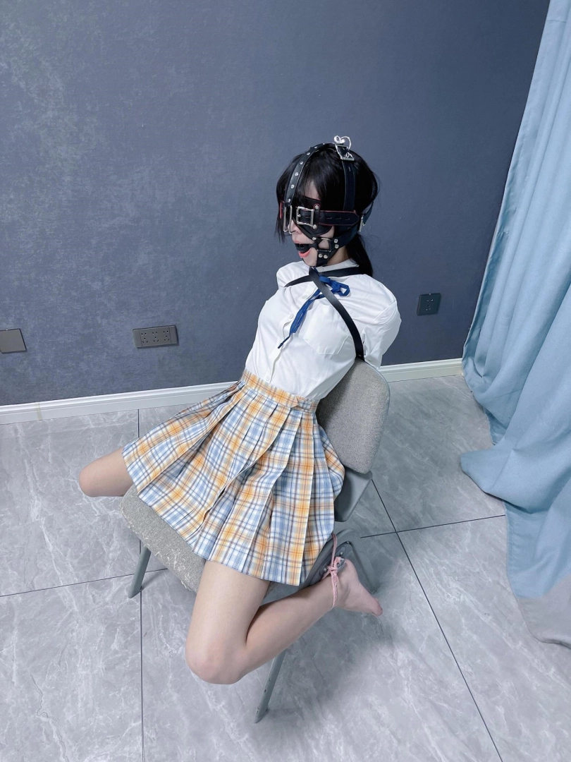 所以这一部我把穿着jk光着小脚的茶茶绑在椅子上,用单手套把双臂固定在椅子背后,然后拉起茶茶的脚腕,让茶茶的脚丫翘起,这样茶茶就被死死固定在椅子上,整个身体都向观众展示,没有一丁点从椅子上挣脱的可能。