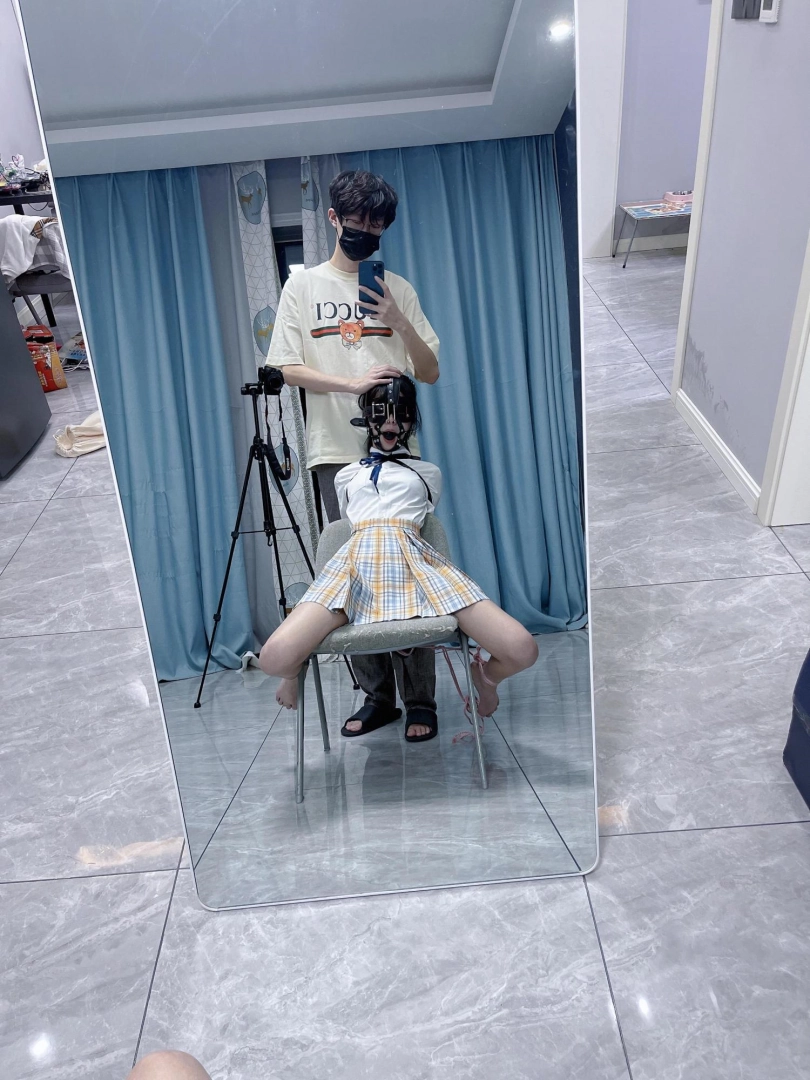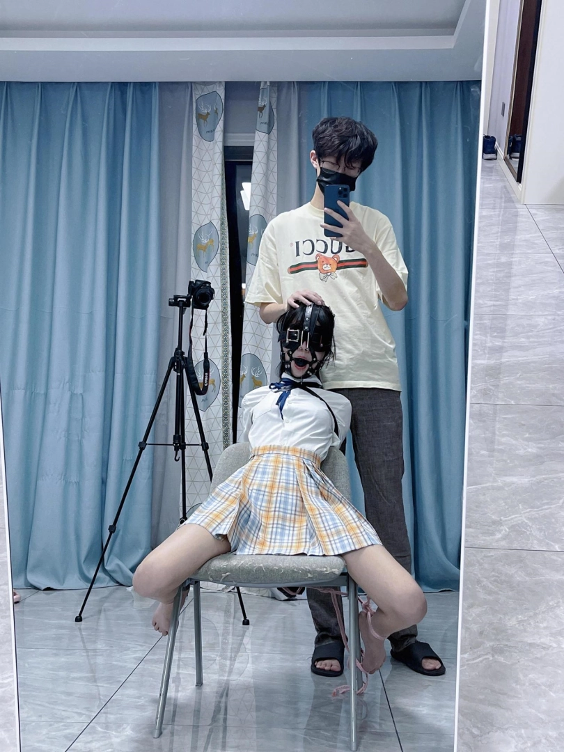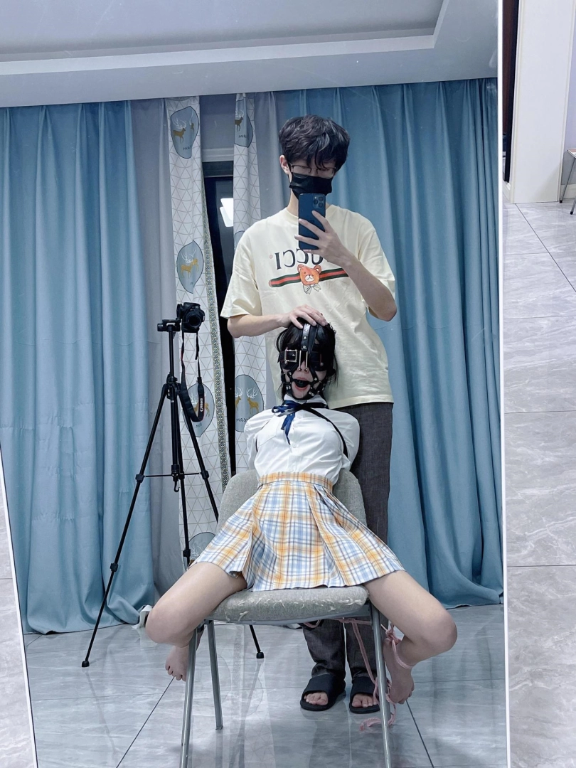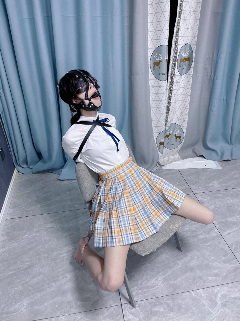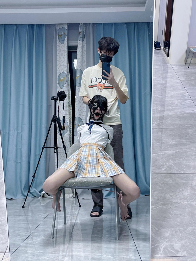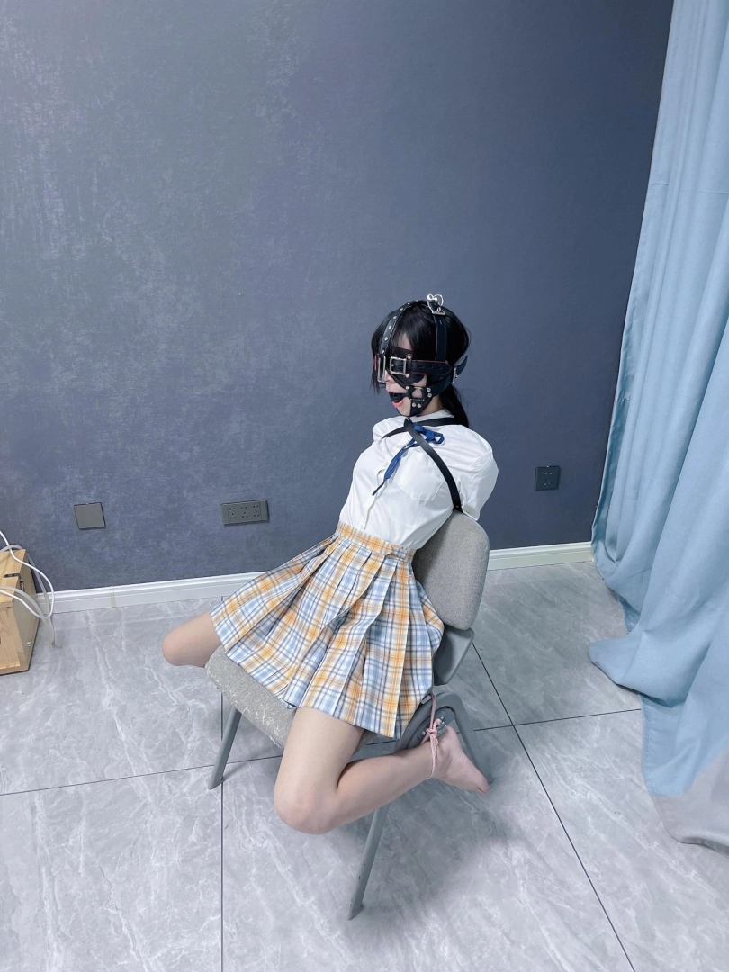 所以这一部我把穿着jk光着小脚的茶茶绑在椅子上,用单手套把双臂固定在椅子背后,然后拉起茶茶的脚腕,让茶茶的脚丫翘起,这样茶茶就被死死固定在椅子上,整个身体都向观众展示,没有一丁点从椅子上挣脱的可能。