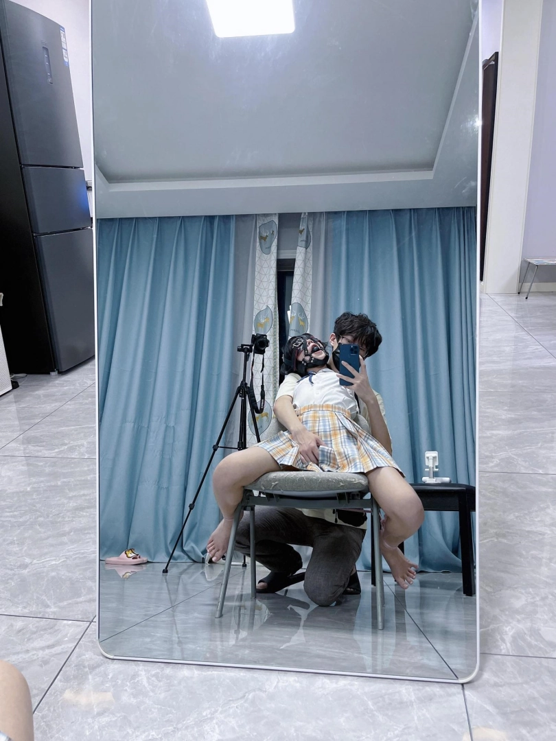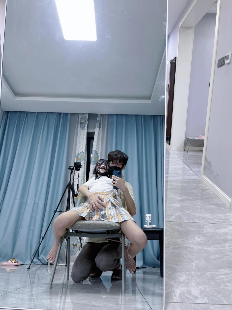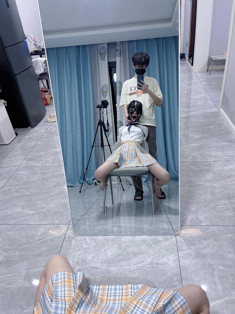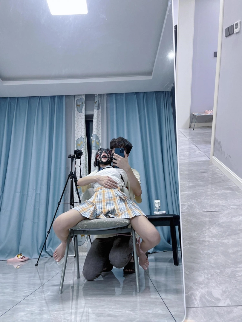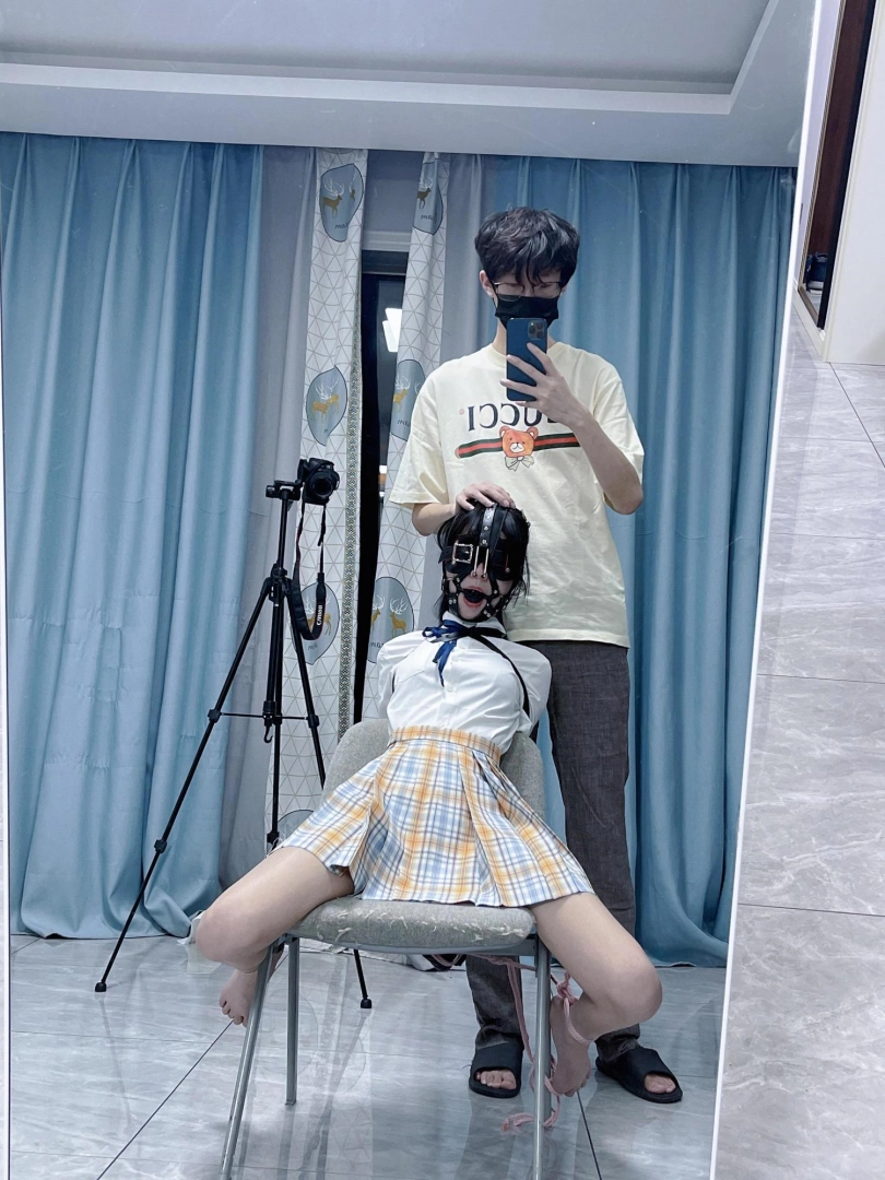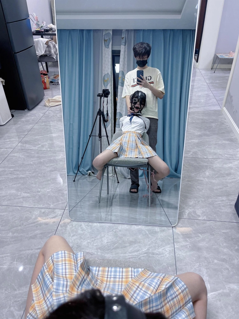 所以这一部我把穿着jk光着小脚的茶茶绑在椅子上,用单手套把双臂固定在椅子背后,然后拉起茶茶的脚腕,让茶茶的脚丫翘起,这样茶茶就被死死固定在椅子上,整个身体都向观众展示,没有一丁点从椅子上挣脱的可能。