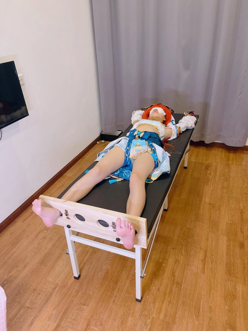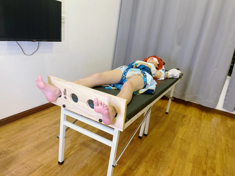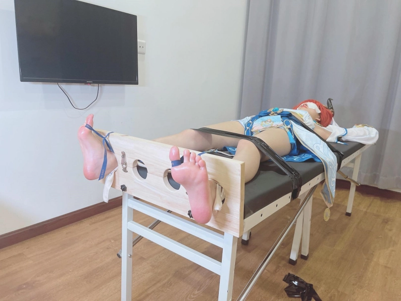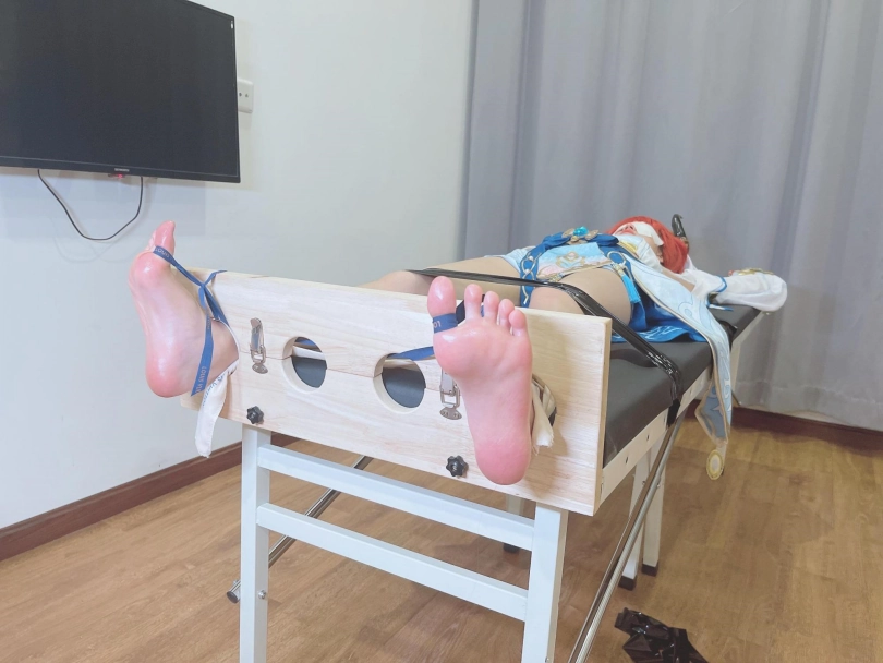 她知道,这次痒刑不会那么简单,因为身边提高敏感度的精油、高强度电击拍、刺轮等挠痒道具应有尽有。与之对应的,她的双手被迫铐在脑袋上方,粉红色的小脚丫也固定在足枷里。