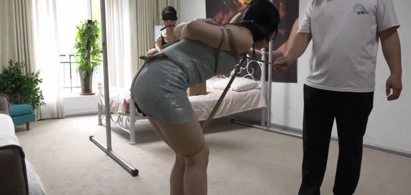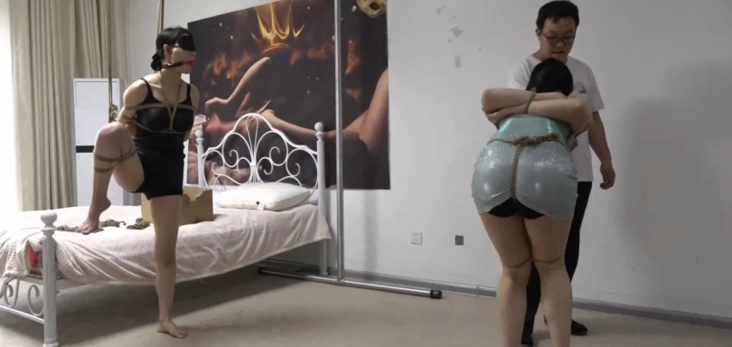 (回顾一下上集内容,刘小萌在自己师姐外出期间接到了一份委托信,没有认真的了解过就贸然的独自一人去完成任务,却被逮了个正着,被当铺老板抓了起来)消失几天的夭玲终于回到了自己的侦探所,但是却并没有看到自己的师妹,不过看到了办公桌上师妹留下的信封。夭玲仔细的将信封看了一遍,才知道自己的师妹居然帮自己完成任务去了。夭玲担心的说:“这个傻丫头,什么都不知道还帮我去完成任务,不行这个时候她可能已经遇上危险了,得去帮她。”不愧是师姐,这么快就猜到自己师妹遇到危险了,哈哈~而夭玲也是通过王主管,被带到了当铺。当铺里的刘小萌此时正被陈老板绑得严严实实的,用绳子将另一条腿吊了起来,全身的重量全部由另一条腿承受,非常的难受。这时关押刘小萌的房间被打开,王主管手上拿着一根绳子,正牵着夭玲走进来(我个人觉得这个镜头蛮不错的)夭玲也是被捆成一种非常难受的姿势,双手缚在身后,膝盖被捆了一道绳子,一根绳索更是将她的脖子与膝盖连在了一起,保持着一种不上不下的姿势,迫使她只能低着自己的身子。被王主管牵着艰难的移动自己的双腿,一步一步的走进来。王主管说:“不好意思了,夭小姐我们老板外出有事,因为这个女人的缘故,所以暂时不能为你解开绳索,只好委屈你了。”接着王主管将夭玲右腿与刘小萌的左腿捆在了一起,另一条腿也是被吊了起来。既然是一对漂亮的姐妹花,当然要试试这种连体式捆绑了,效果还不错。这样捆起来也挺难受的,因为两个人仅能活动的腿都被捆在了一起,一乱动的话就会带动另一个人,活动也不方便也是辛苦柳洋姐姐与吴晗姐姐了。