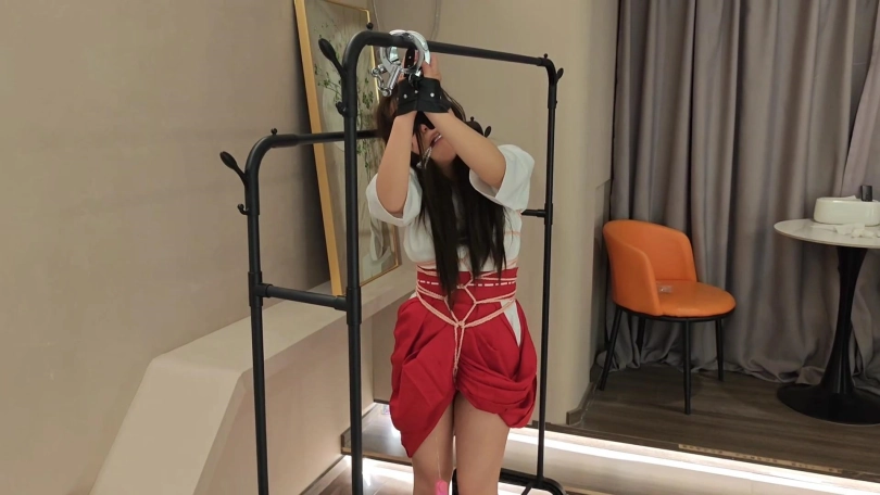 苏苏身着巫女装扮,先给自己戴上了手铐脚镣,之后塞好td,不一会儿便有了感觉,在床上挣扎蠕动,之后给自己绑好了龟甲缚,戴好眼罩,进行一段距离的跪爬惩罚,td露在地上跟着被拖动十分涩涩,接着塞上口球吊在架子上td开到最大并抚摸tk,打屁屁,不一会儿苏苏就腿软了,最后将手帮到后面m腿放置,最终达到了小高潮