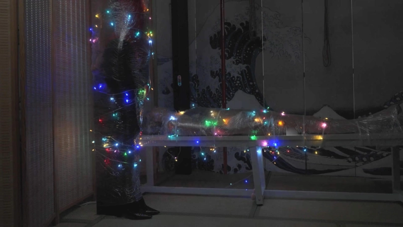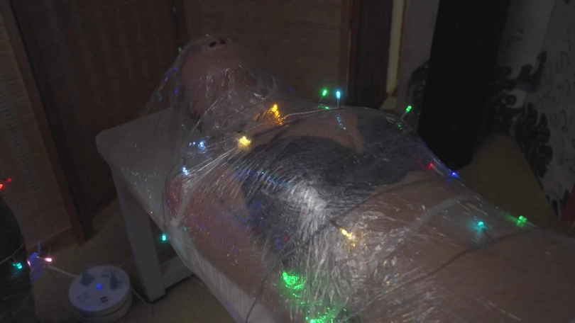 于是嗷嗷成为了月亮的圣诞礼物。她将礼物用保鲜膜和扎带打包束缚起来,用TD玩弄她,TK她的双脚,抚摸她的身体。最后月亮和象人一起把嗷嗷束缚在一张桌子上,并用彩灯点缀她的身体。