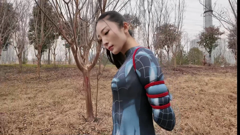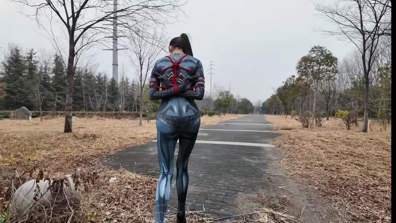 佳佳女蜘蛛装扮,户外散步行走,第一次拍户外题材,佳佳和我内心还是非常紧张的,找了个绿化带,冬天的户外还是很冷的,佳佳非常敬业,五花大绑,不愧之前做过模特队长,走路还是标准的模特步,身段更显优美