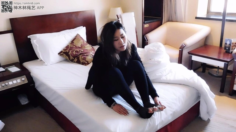 妹子下班回家,躺床上就睡了。这时,偷偷潜伏在屋内的坏人出动,掀开被子,撕开丝袜,锁上脚趾铐,再盖上被子。妹子睡醒,发现身体有点不对劲,掀开被子一看,发现被戴上了脚趾铐,很诧异。妹子下床,各种找钥匙,却找不到,很着急。坏人再次出现,拿来一个架子,解开脚趾铐,把脚趾吊在架子上,然后锁上脚腕、手腕、拇指,离开了。妹子彻底绝望,十分疼痛。