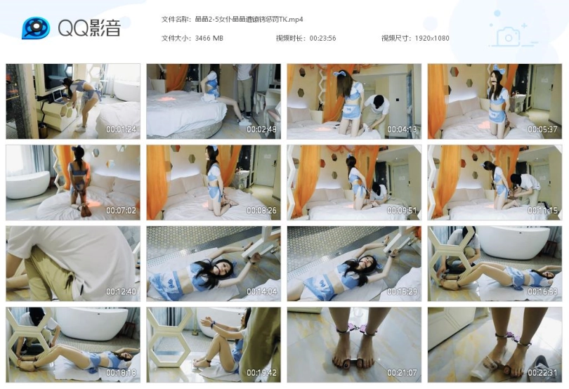大概的剧情是:女仆平时在家里都带着脚镣,在打扫卫生。无意间看到主人的电脑还在开机,于是停下手头的工作,在玩电脑。主人悄悄地回来了,结果发现女仆正在偷懒,玩自己的电脑,十分生气,呵斥女仆。主人脱下她的鞋袜,锁上脚趾铐,让女仆跪下,解开手铐锁在背后,手脚用脚镣链接,让她跪下反思,然后离开。女仆见到主人生气,很害怕,一直在认错,哭了出来。主人回来了,还是很生气,解开镣铐,脱下衣服只剩内衣,让女仆躺在床上和椅子上,手穿过栏杆铐上,脚也穿过另一对栏杆铐上,脚趾铐住,把钥匙锁在一只脚趾上,带上口球然后离开。女仆一直扭动身体挣扎,想够到钥匙却不行,想说话也不行,十分难受。主人回来了,决定惩罚女仆,于是开始挠脚心。女仆十分难受却说不出话来,使劲求饶。最后主人决定原谅她,解开镣铐。但是决定以后不让穿鞋了,又加上脚趾铐工作,又都给锁上。妹子光着脚工作,打扫卫生,连脚趾也被锁了,十分不便。