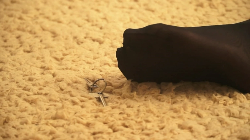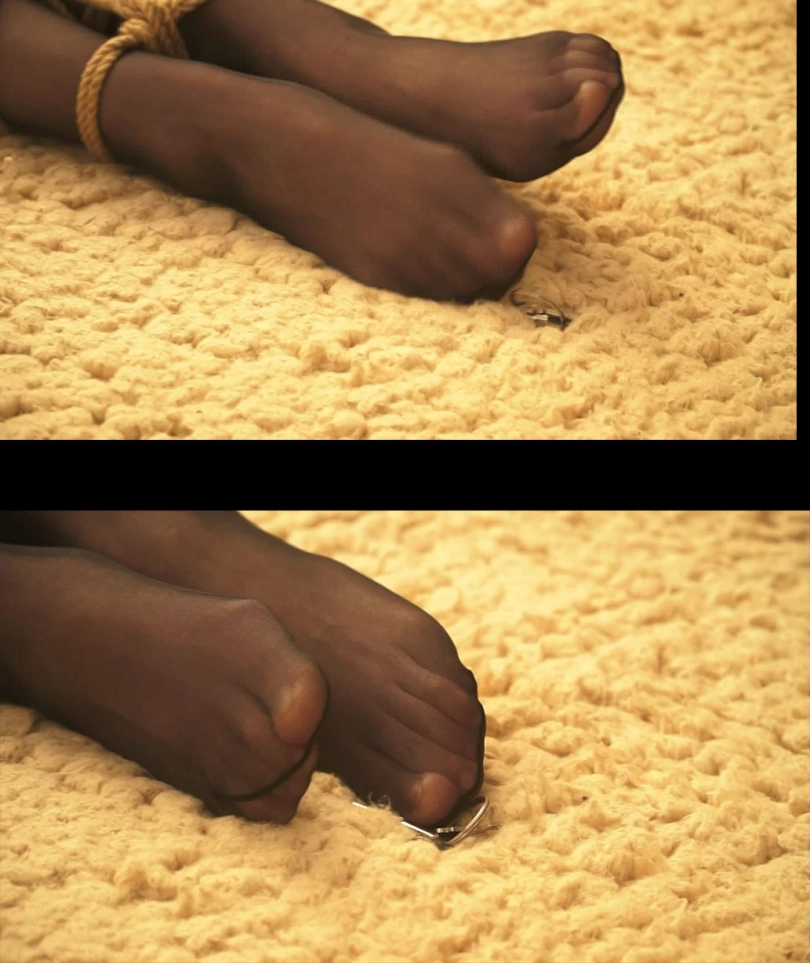 这时美女惊讶的发现铁链钥匙就放在不远处,她先吃力用丝袜脚够钥匙,但她丝袜外面还套了一层丝袜,2层丝袜太滑够不到钥匙。