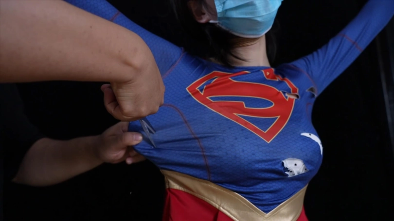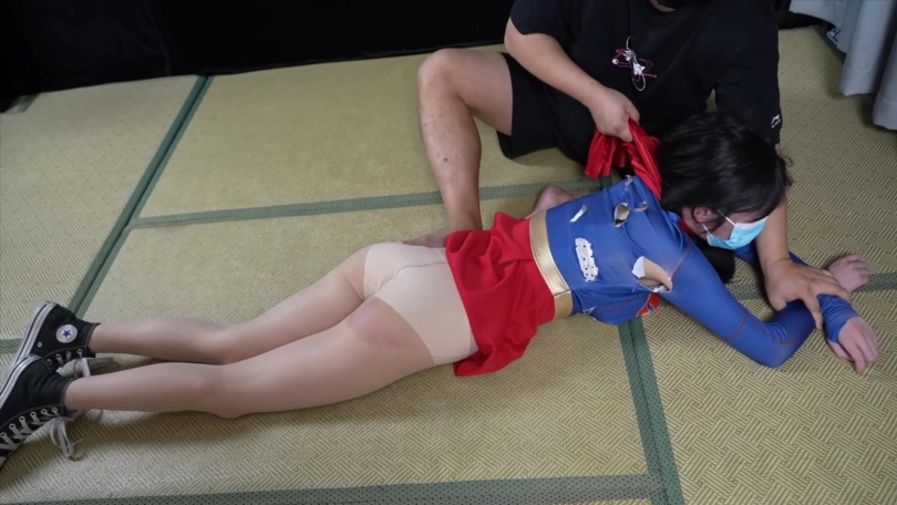 又是一番玩弄后,把女超人倒吊在了竹竿下,离场!
