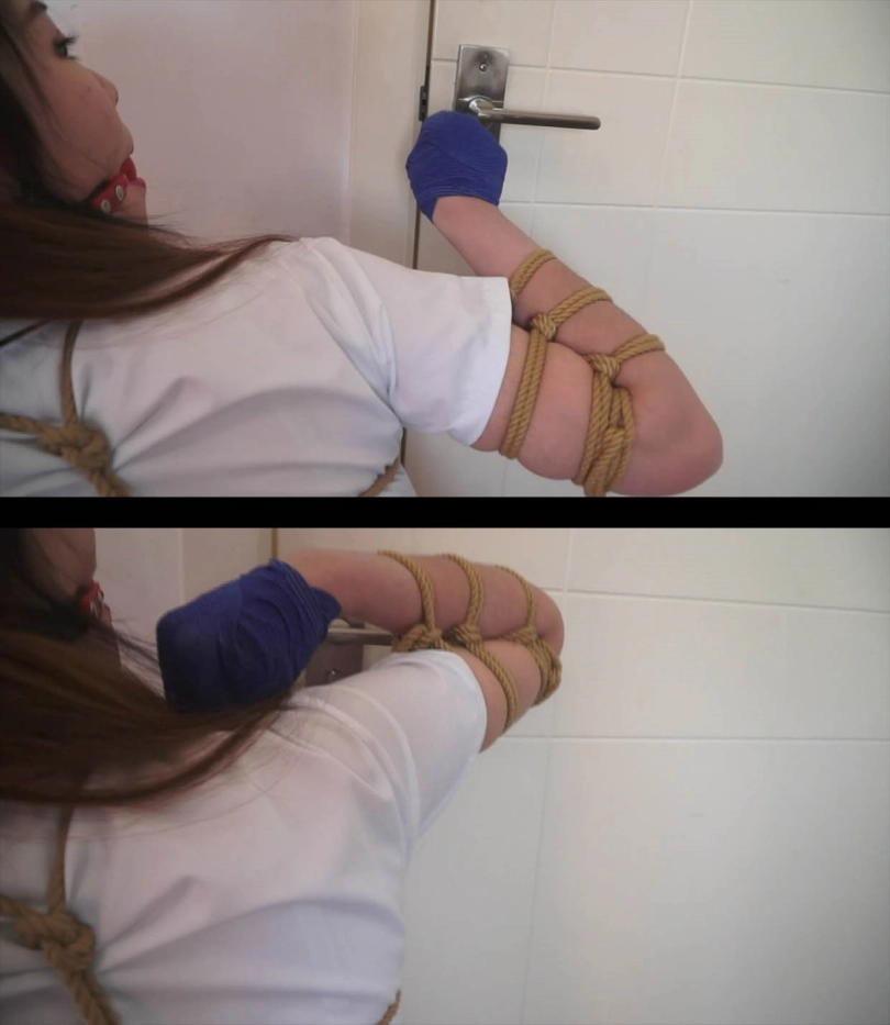 她害怕的赶紧把被子弄开,发现自己居然被绳子四肢折叠的捆绑了起来,就如同一只小狗一样,而唯一可以解缚的手指却被层层绷带完全包裹起来了。