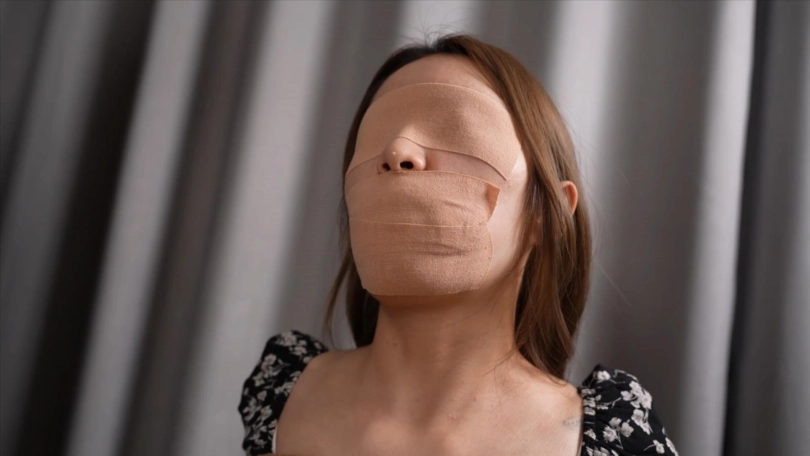 黑色连衣裙,肉丝,三叶草贝壳头,胶带蒙眼封嘴,双脚离地的椅缚!