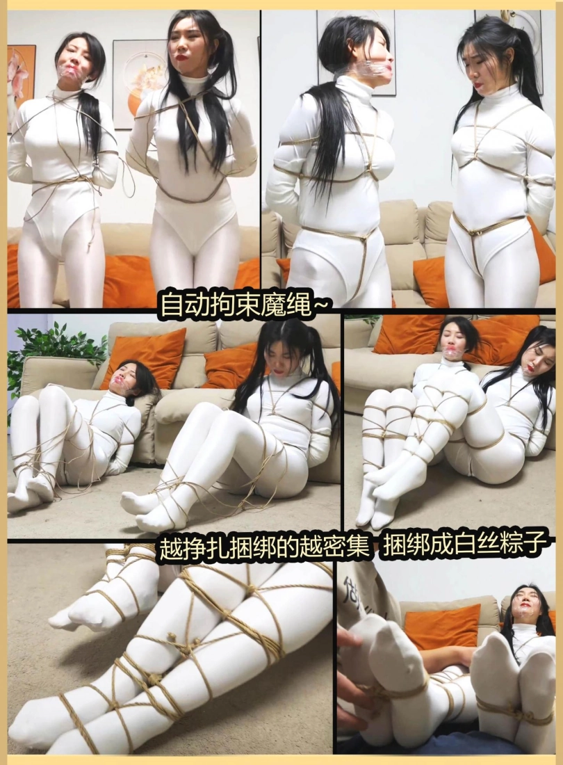 【逍遥】《鬼屋缚影——自动拘束魔绳》刘洋 吴晗性感油光白丝美女 自己捆绑的魔绳 越挣扎捆绑越紧 超严密捆绑白丝人粽
