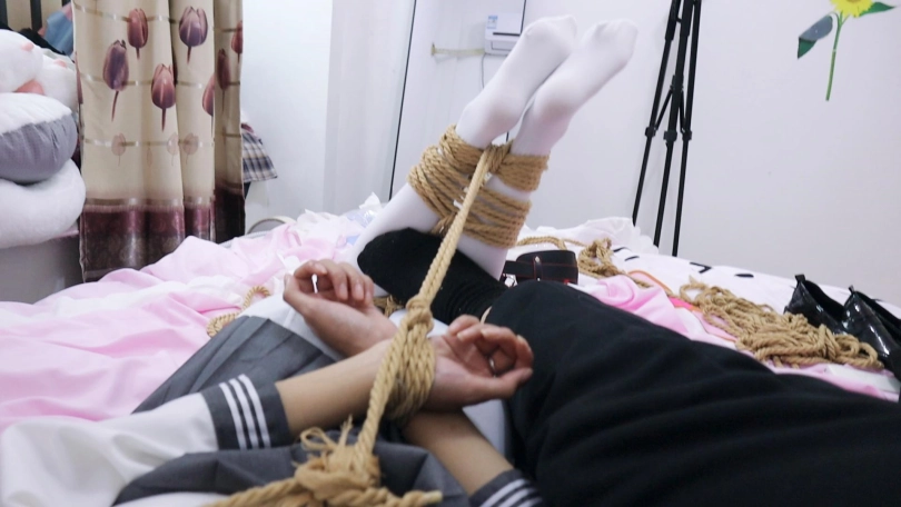 看我怎么收拾你 超青春清纯的脸蛋露脸因为绳子的捆绑变得扭曲的面目已经诠释一切了 穿着小皮鞋的白丝脚脚高高被绳索高高吊在欧式床上,玩过之后又被驷马绑好继续玩弄敏感点,