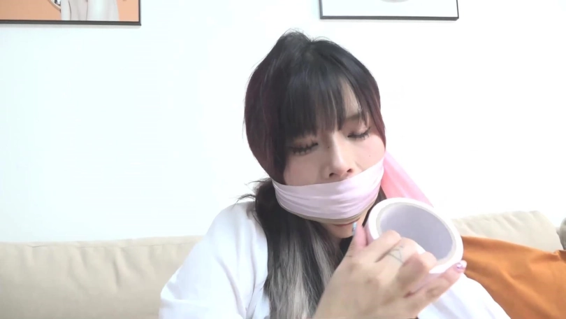 美女脱下一只棉袜塞入嘴里用一条丝袜勒住嘴巴,接用胶布把自己嘴巴缠绕起来,然后拿出炸弹在镜头前挥了挥,黑屏。