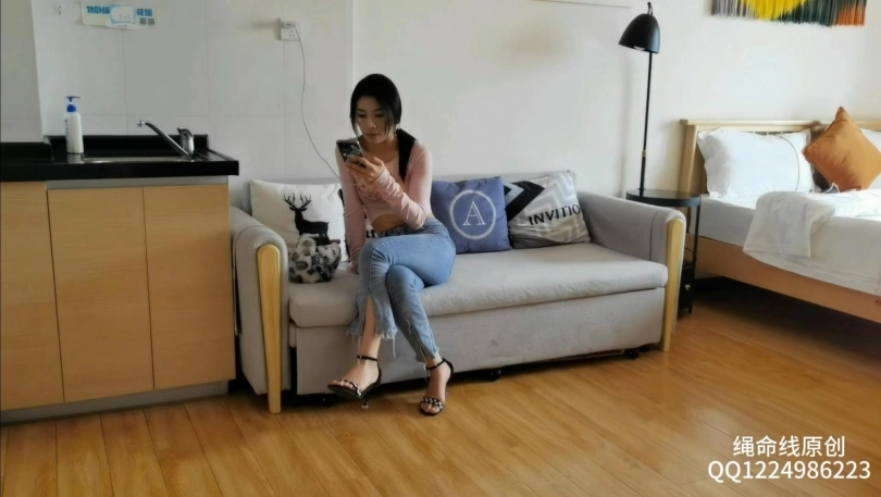 是个很漂亮的妹子,也很放得开,绑起来还能玩手机。