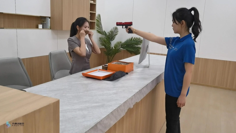 6)下一个场景中,面试者来到公司,强盗假装她是经理,带她进了老板室为面试。在劫匪和面试者坐下之后。桌下的接待员在挣扎、吵闹;强盗试图踢她阻止她,并告诉面试者这声音是从附近正在装修的房屋。面试者感觉不太对劲试着离开,但是劫匪拿出枪来威胁她停下来,让她脱掉衣服。面试者别无选择,只能照做。然后抢劫犯要求她把手放在她背后用拉链绑住她的手腕和脚踝,然后胶带封住她的嘴巴;面试者尖叫着发出“嗯嗯”的声音。