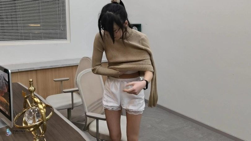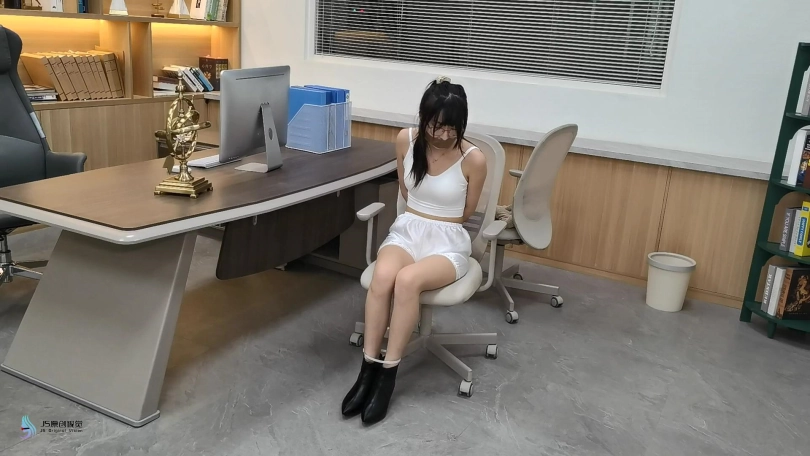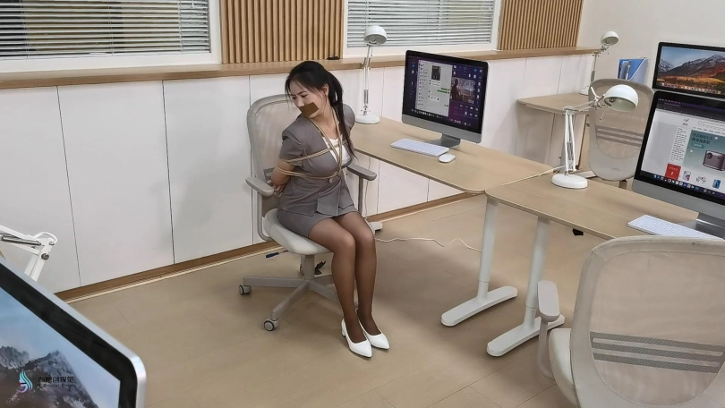 2)在下一个场景中,接待员穿着棕色制服连裤袜和白色高跟鞋被捆绑在椅子上。她正在努力的发出“嗯”的声音。