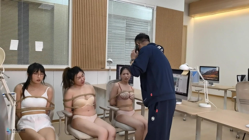 8) 在接下来的场景中,所有的女孩都被绑在办公椅上。然后劫匪打开了保险箱得到珠宝,并使用手机录下她们的现状,3名被绑女子向着镜头痛苦地呻吟着,不停扭动身体,挣扎,嘴里被胶带封着并发出「救命啊,不要再拍」。劫匪并告诉女孩们,除非她她安全的离开,不许她们报警,否则这些视频将被发布在互联网上。女孩们哭了试着用她塞住的嘴说“不”。