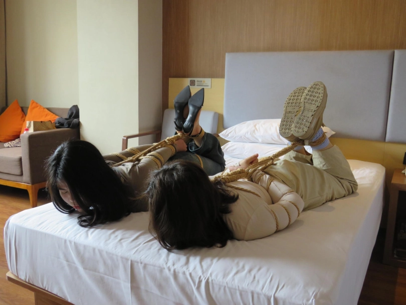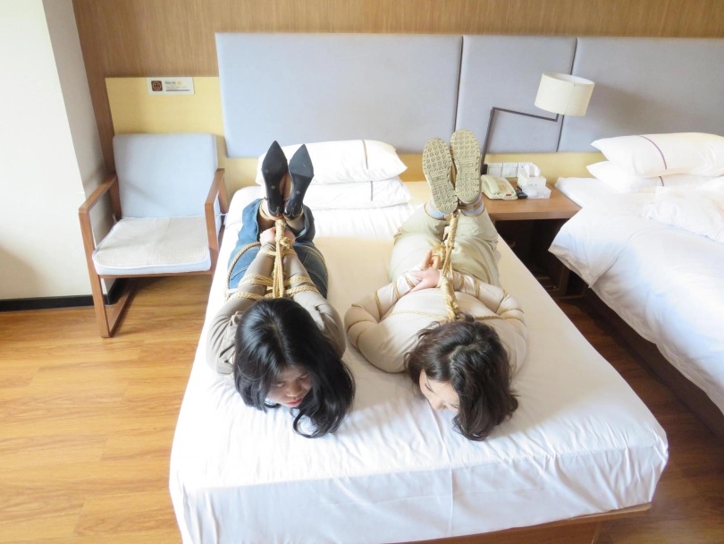 安然和小莹的简单驷马放置,一个学生一个老师,被绑起来之后还是有点不好意思的,安然直臂手麻了,小莹不紧不慢的帮她解,不知道这种是不是老师对学生的惩罚,哈哈哈!