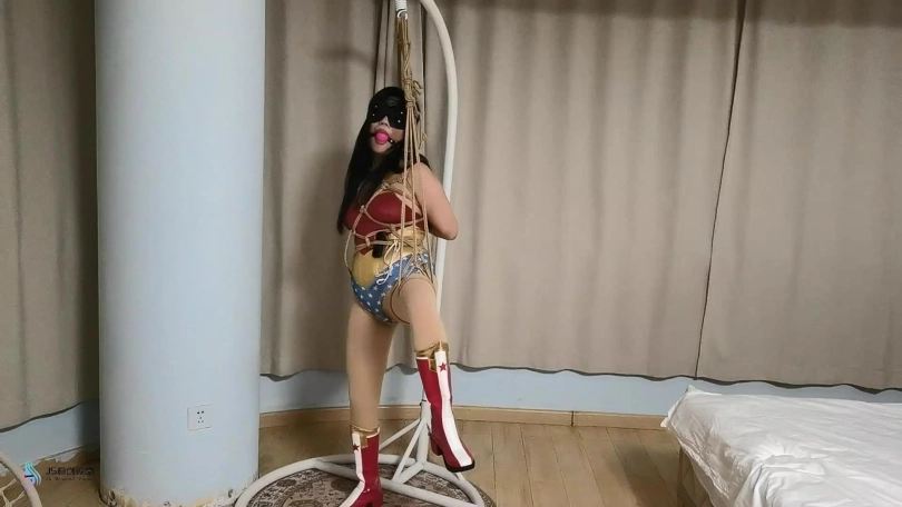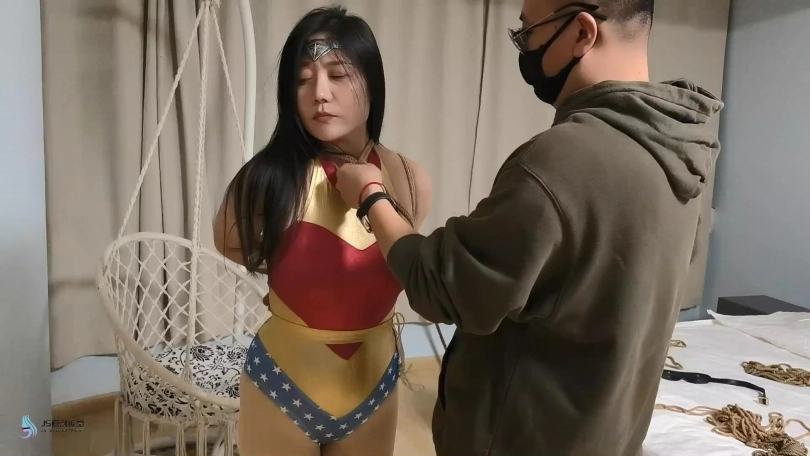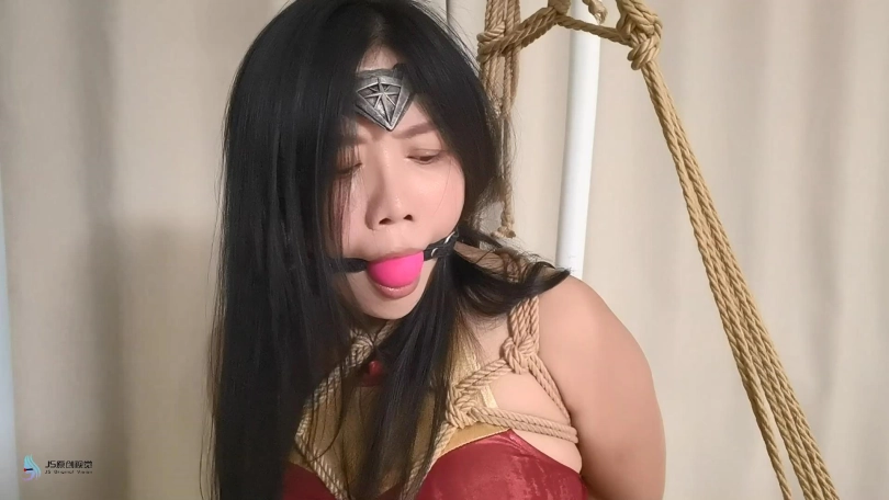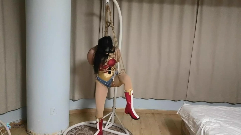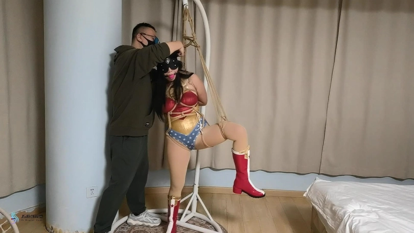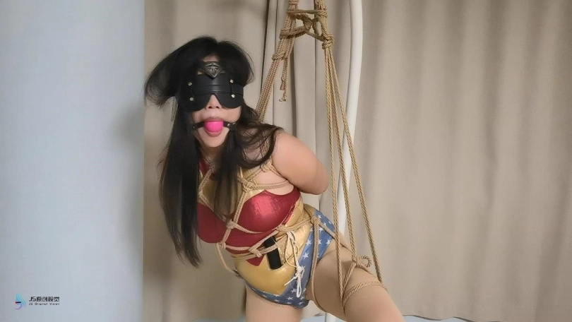 神奇女侠来到老A的窝点,想让对方束手就擒。老A自知不是女侠的对手便说,如果女侠能挣脱他手上的绳子,他就乖乖的和女侠走。女侠高傲的看着对方同意了。女侠被捆绑好后惊慌的发现无论自己怎么挣扎,根本就挣脱不了绳子的束缚。这时老A告诉女侠,这是有魔法的绳子,绳子会吸收女侠的神力,现在女侠就是一个普通女人的力量。老A把女侠单腿绑了起来,女侠嘴里不停的咒骂着他卑鄙。老A用口球塞住了女侠的嘴,让她保持安静。蒙上了她的眼睛。并拿来一个电动TD放进女侠的裆部。很快女侠的挣扎力度开始变弱,并发出呻吟声。。。