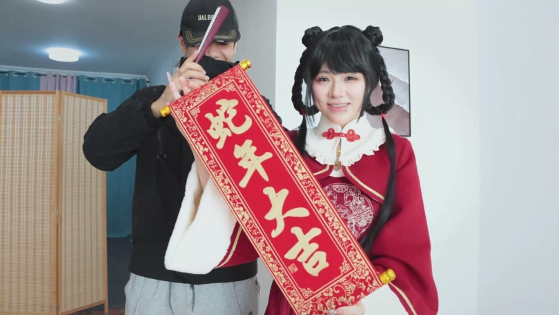等老哥转过身去的时候,梦尘从老哥身后变出写着“蛇年大吉”的条幅,拍了拍老哥说:嘿!被我骗了吧~