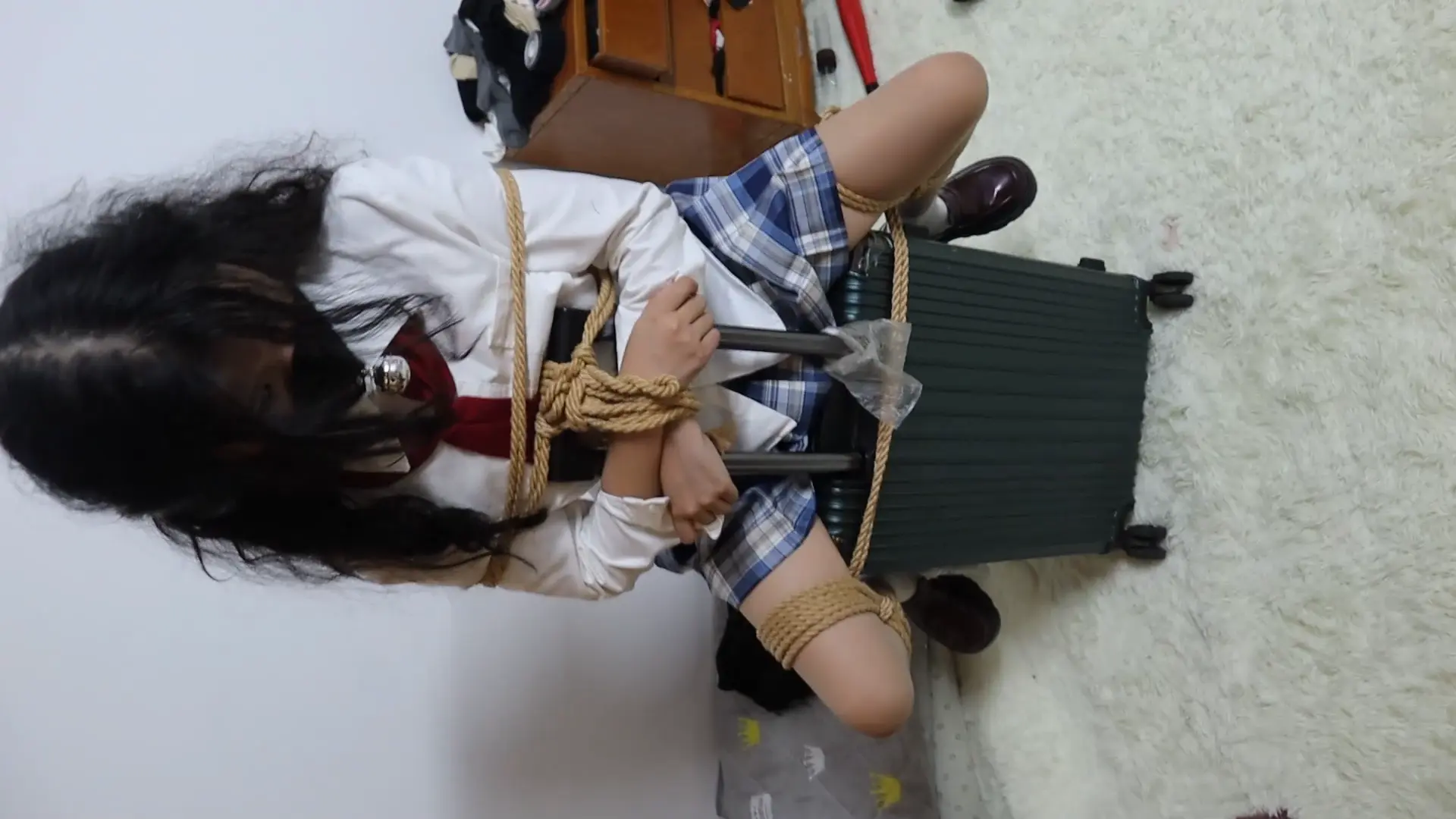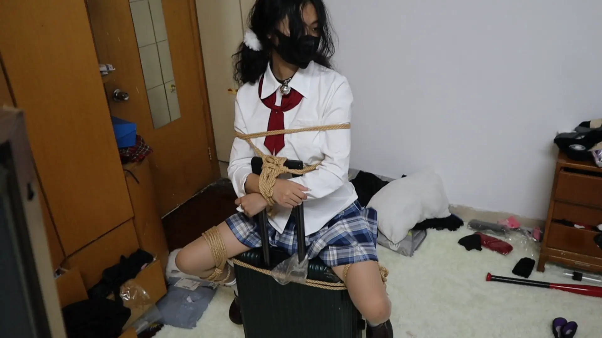 wei迷晕后被捆绑行李箱上,坏人用尽各种鞭刑凌辱这个可怜JK学生妹,身体也很敏感,脱鞋挠痒的时候,害怕的发抖,后面各种鞭子其上打的是真狠,强迫鞭打数数,不过属性强,被虐的爽也是真的爽,又菜又爱玩的小女孩,一边哭一边叫不停,被打哭的梨花带雨的求放过 你抓别人吧,求求你了,后面拍摄前露出了可爱漂亮的脸庞 (最后拍完彩蛋是虞琳自己选的鞭子的各种对话)