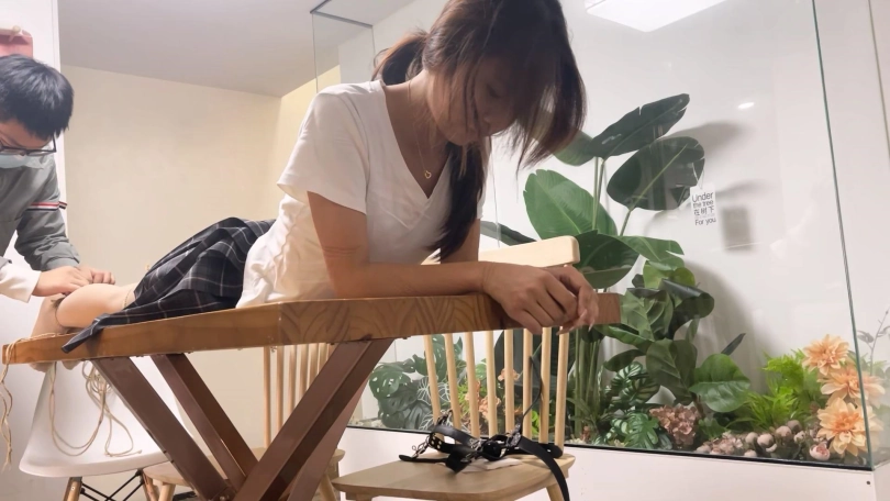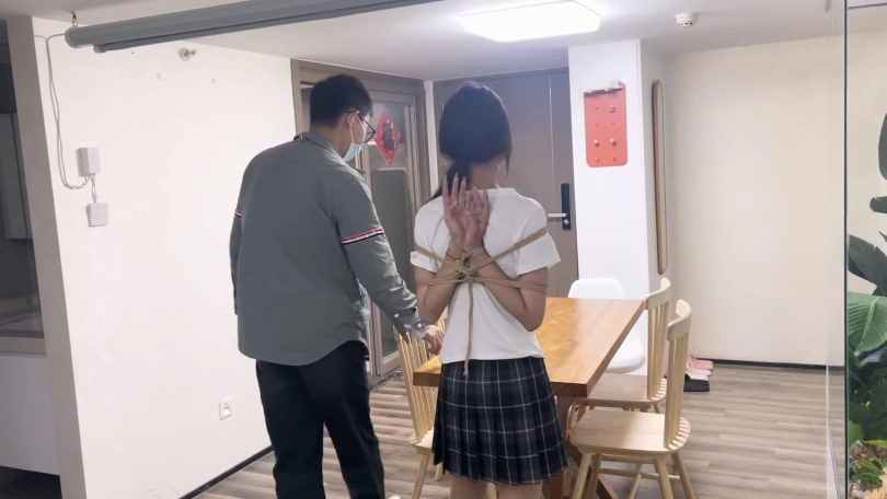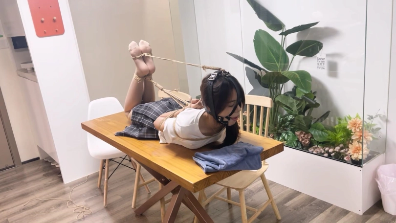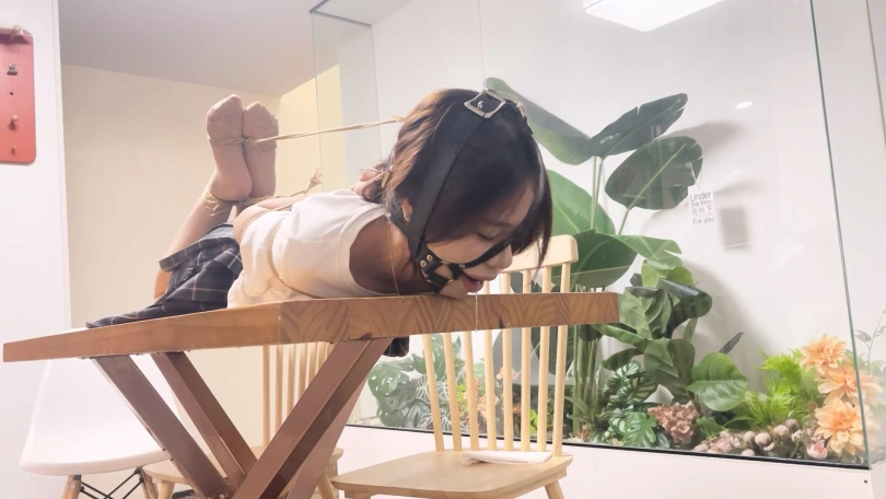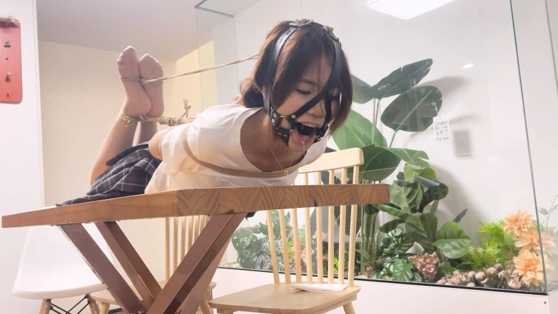 一一换上了JK制服,更有学生妹气质了。对于一一这种柔韧性和耐力都非常好的妹子必须安排上最紧的后手观音驷马来考验她,紧紧的驷马放置在桌子上最大限度的限制了活动能力,再给她带上马具口球强制抬头放置,没过多久口水就流成一条线了。