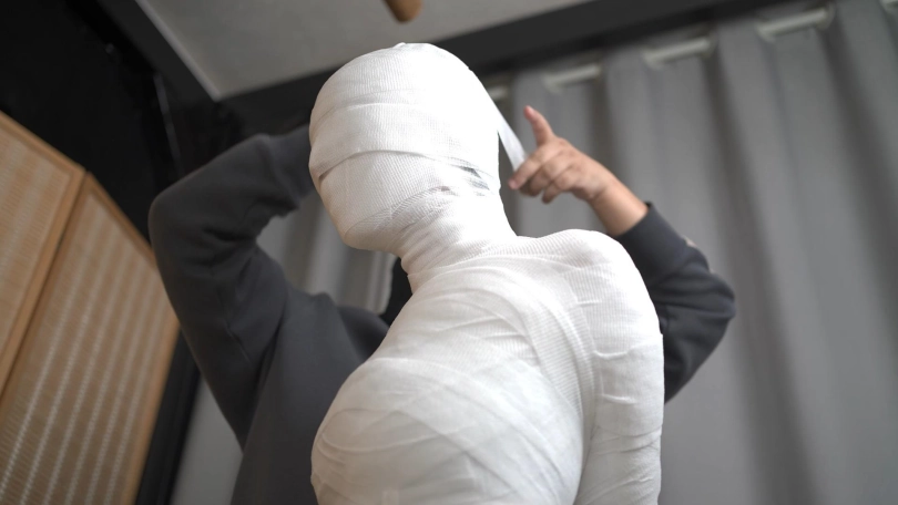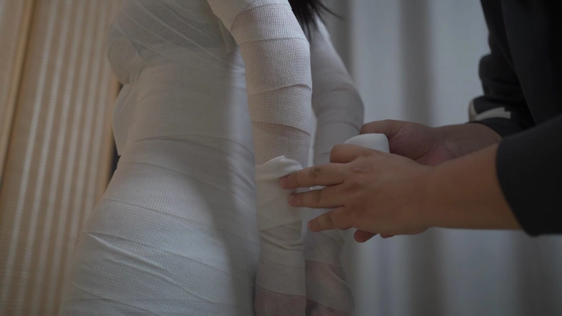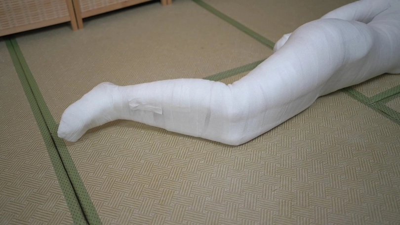 每个胳膊,每一条腿都要缠好以后,再开始整体的全包