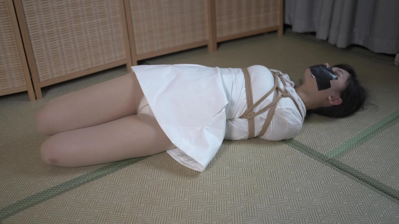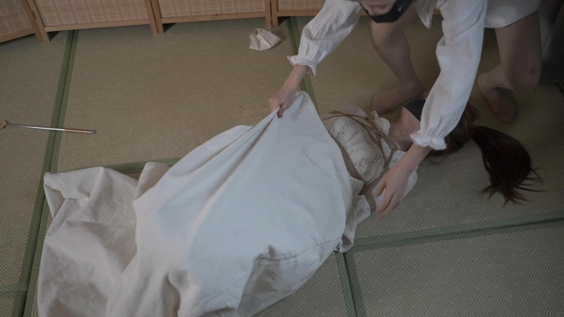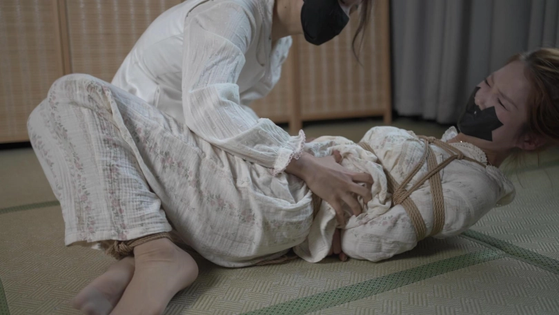 小o觉得机会来了,她努力挣脱了捆绑,趁着雨溪熟睡上去用绳子勒晕了她,接着把她驷马捆绑胶带封嘴。