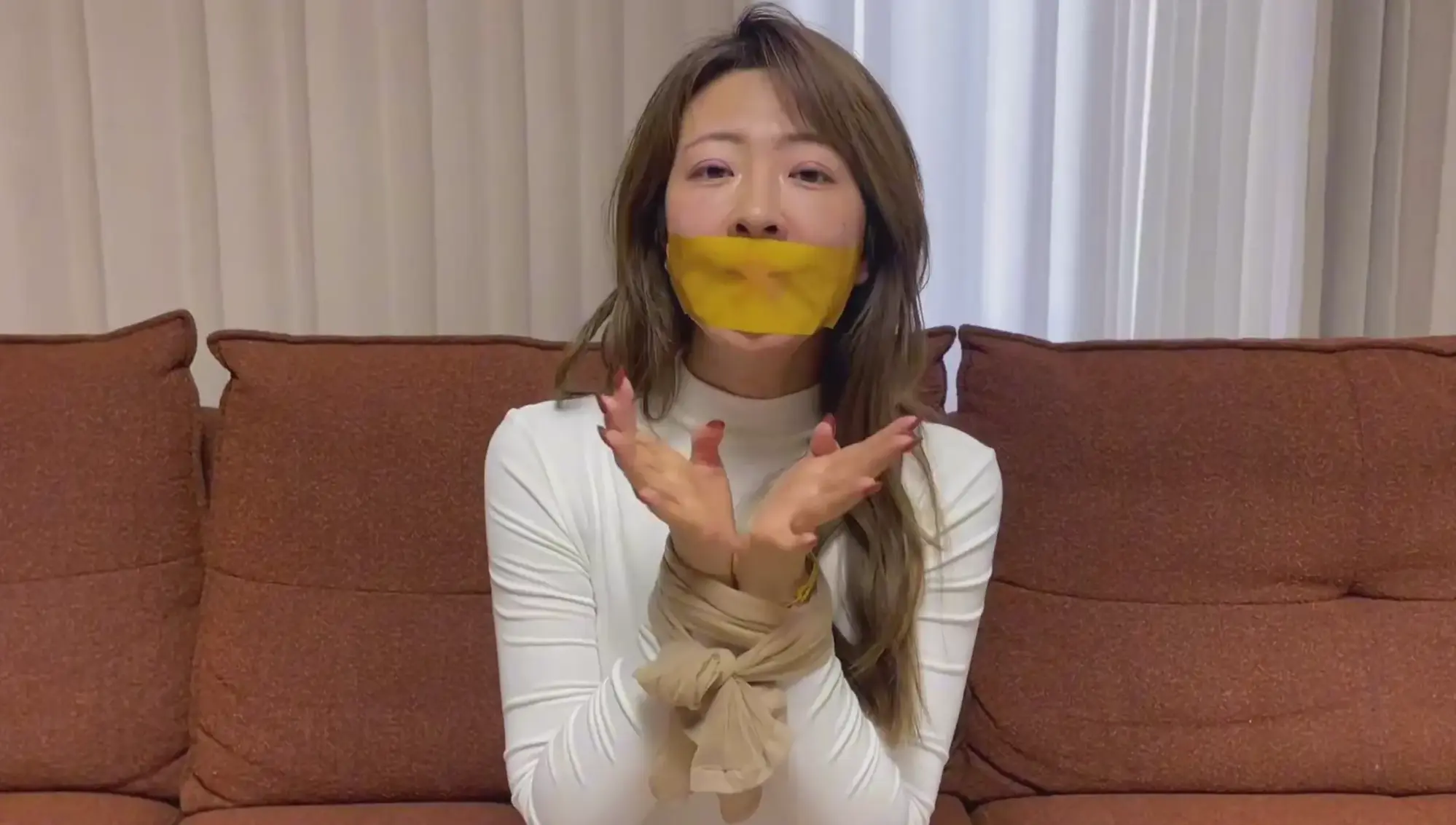 拿出黄色胶带贴合好在自己的嘴唇上,然后用丝袜把自己手正面绑住。