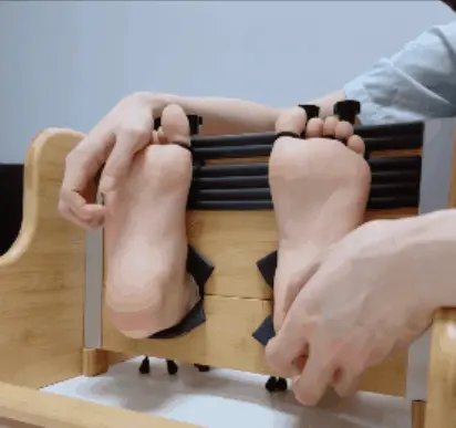 一阶段:足枷不间断挠痒地狱-上半身日式紧缚,给妹子戴上眼罩和马具口球,两只脚固定在足枷里,每一根脚趾都固定在足枷上,完全暴露脚底。