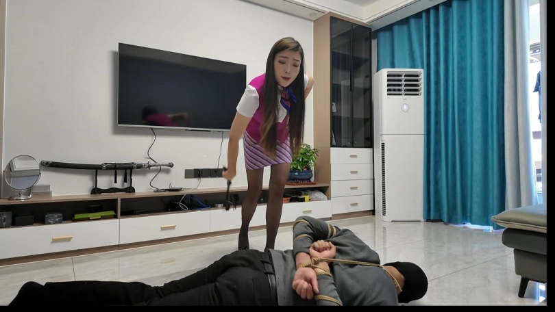 空姐佳佳回到家家里,感觉家里进了贼,就到处查找,佳佳穿着高跟鞋,声音很大,经过一系列的查找,终于把歹徒揪拉出来,五花大绑一顿收拾,打累了,去上厕所,结果贼人偷偷想逃跑,发现门被锁上,就又躲了起来,空姐上完厕所回来,发现不见了贼,又是一顿查找,找到后加倍输出收拾贼人,最后把贼送到该去的地方...