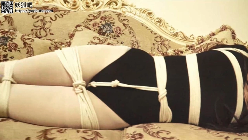 10. 男女劫匪分工合作。男劫匪再用一条20米长的棉绳,在李然的上胸绕了3圈,再在下胸绕了3圏,最后在两边腋下拉直后收紧,在后面手肘的绳子打结。男劫匪再用一条20米长的棉绳把李然的双手与腰部拼拢绑在一起。此时李然的上半身己经不能够动弹。同一时间,夏炎拿了沙发上的一对黑色的及膝舞蹈袜套给李然穿上。夏炎先从李然的脚踝开始捆绑,先用一条10米长的棉绳全用上绕上了多圈后,再把棉绳穿过绳圈打直收紧,就像一个8字。之后,以同样的方式用10米长的棉绳把李然的膝盖上、下,大腿分别捆绑,同样都是8字圈的。