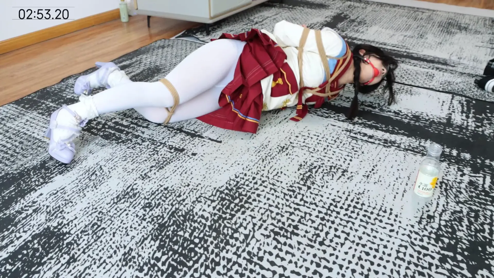 惩罚环节:参考惩罚环节的图片,完全按照图中的拘束方法将模特拘束,开始捆绑放置,每有一个没按时完成的项目多放置3分钟(例如:有7个没完成的项目就放置21分钟),并在放置过程中将自己选的图片内容详细地描述出来,包括人物、服装、捆绑方法、动作、以及图片内主角可能会遭遇的事情等等(描述完了时间还没到的话就再重复描述一遍)。